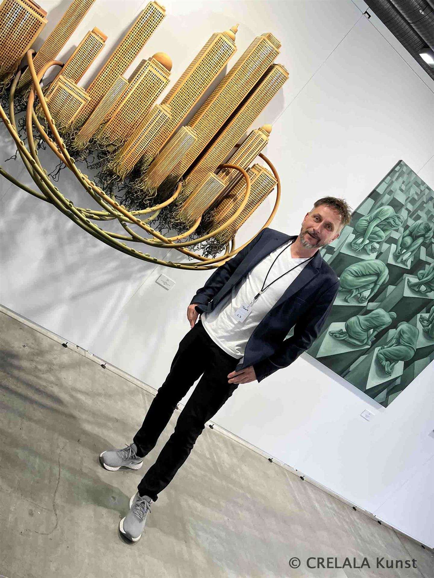 Wenn eine spiralig aufgewundene Reifenschnecke in Hochbauten endet, erkennt man bereits, was der Künstler im Gespräch unterstreicht: Die Faszination Megacities. Die Faszination von Hochbauten, Wolkenkratzern und Türmen ganz allgemein. Wie fügen sich Menschen in diese anonyme Atmosphäre ein? Das Gewimmel der Menschen mit all ihren smarten Lösungen für sich und ihre Leben. Plötzlich scheinen sich Turmbauten ihrer Fundamente zu entledigen und entwurzeln. Wie abgerissene Nervenenden wirken die sich auflösenden „Untermauern“ die samt Gebäude zu entschweben scheinen. Als wäre die Erde in Auflösung begriffen. Würde sich verflüssigen, um schließlich als Nebel zu entfleuchen