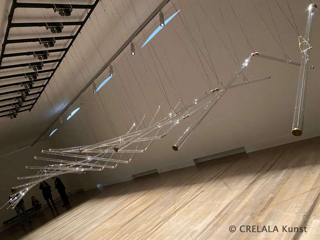 Viele haben über die Kunst von Lonneke Gordijan und Ralf Nauta berichtet und Jeder findet eigene Worte. Stundenlang könnte man den, wie Flügel schlagenden Bewegungen der Glasstäbe zuschauen, in denen das auftreffende Licht reflektiert wird und von innen nach außen, dann von außen nach innen wandert. Die langsame Wellenbewegung ist wie das sanfte Dahinwiegen des Wassers der Ozeane, oder eines Sees, oder Binnenmeeres. Das auftreffende Licht wird gespie(ge)lt, wie ein Instrument der Moleküle. Die Glasröhren veranschaulichen, wie unbeschleunigte, konstante Teilchenbewegung aussieht und man kann Analogien in Physik und Natur erkennen.