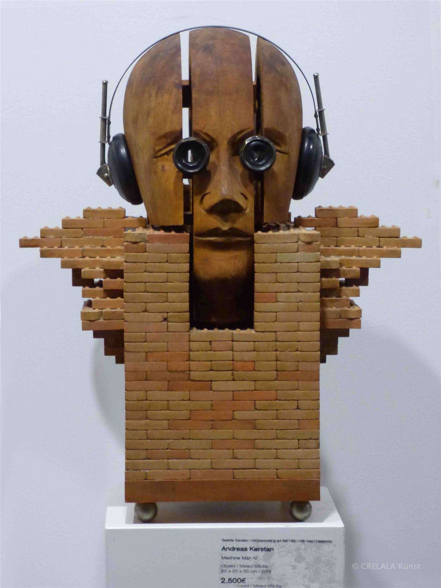 Andreas Kerstan hat seinen dreigeteilten Kopf auf einen Turm auf Rollbrett aus Mauersteinen (Bricks) montiert, die wie Lego aussehen, ein Turm, dem scheinbar Flügel entwachsen. Der Kopf selbst mit ZWEI Okularen, die auf den ersten Blick wie eine Brille aussehen und mit Kopfhörern auf den Ohren, deren Antennen drehbar sind. Sein Machine Man IV aus dem Jahr 2016 bringt ins Grübeln.
