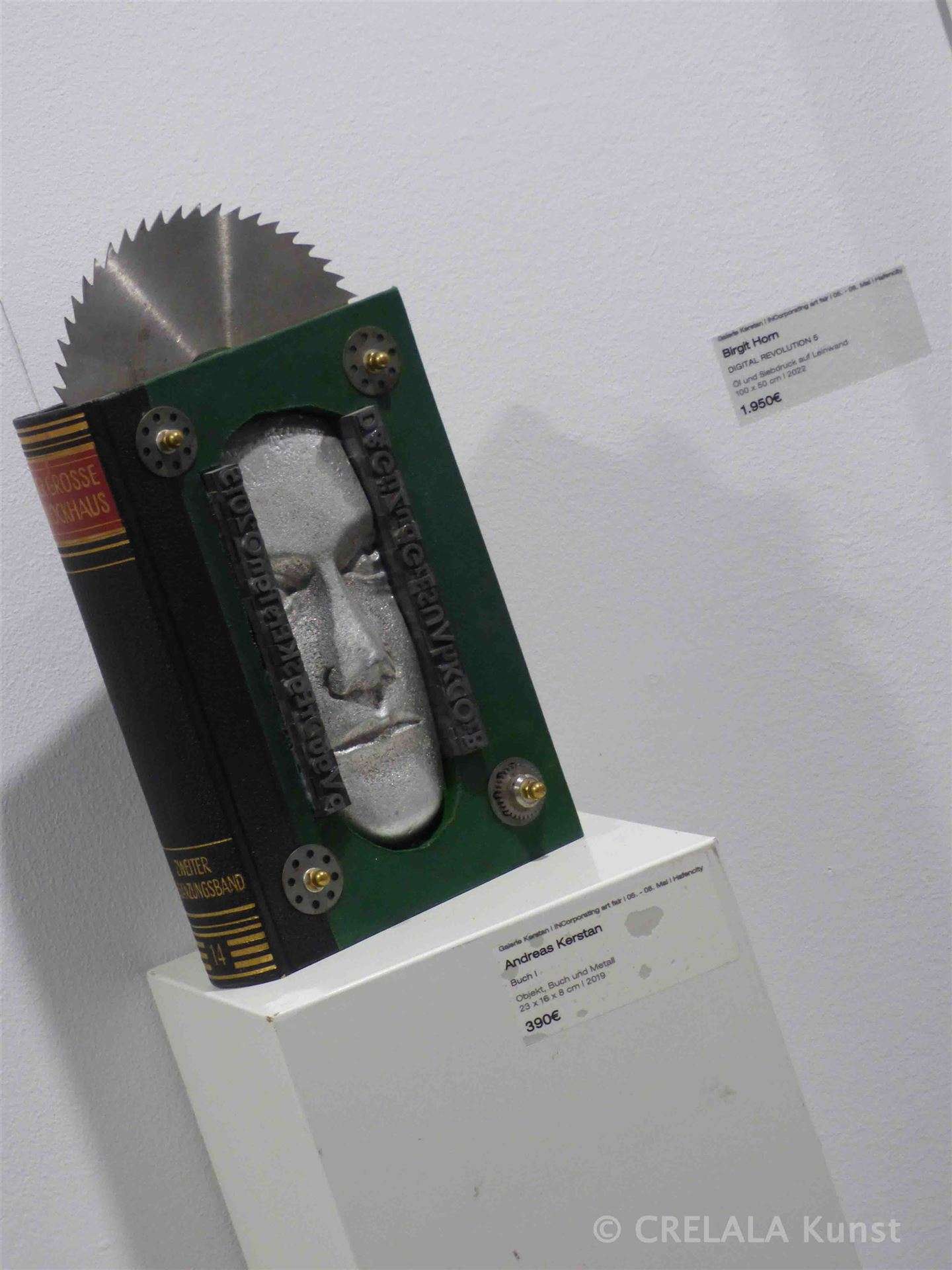 Andreas Kerstan hat einen Perückenkopf dreigeteilt, der an eine Arbeit von Raoul Hausmann von 1919/20 erinnert. Der Mechanische Kopf (Der Geist unserer Zeit) hatte seinerzeit noch Lineal, Uhr, Kamerazubehör, ein Nummernschild (22) und einen typografischen Zylinder collagiert angehangen und stand für den Zeitgeist, der schon damals metrisch geprägt war.