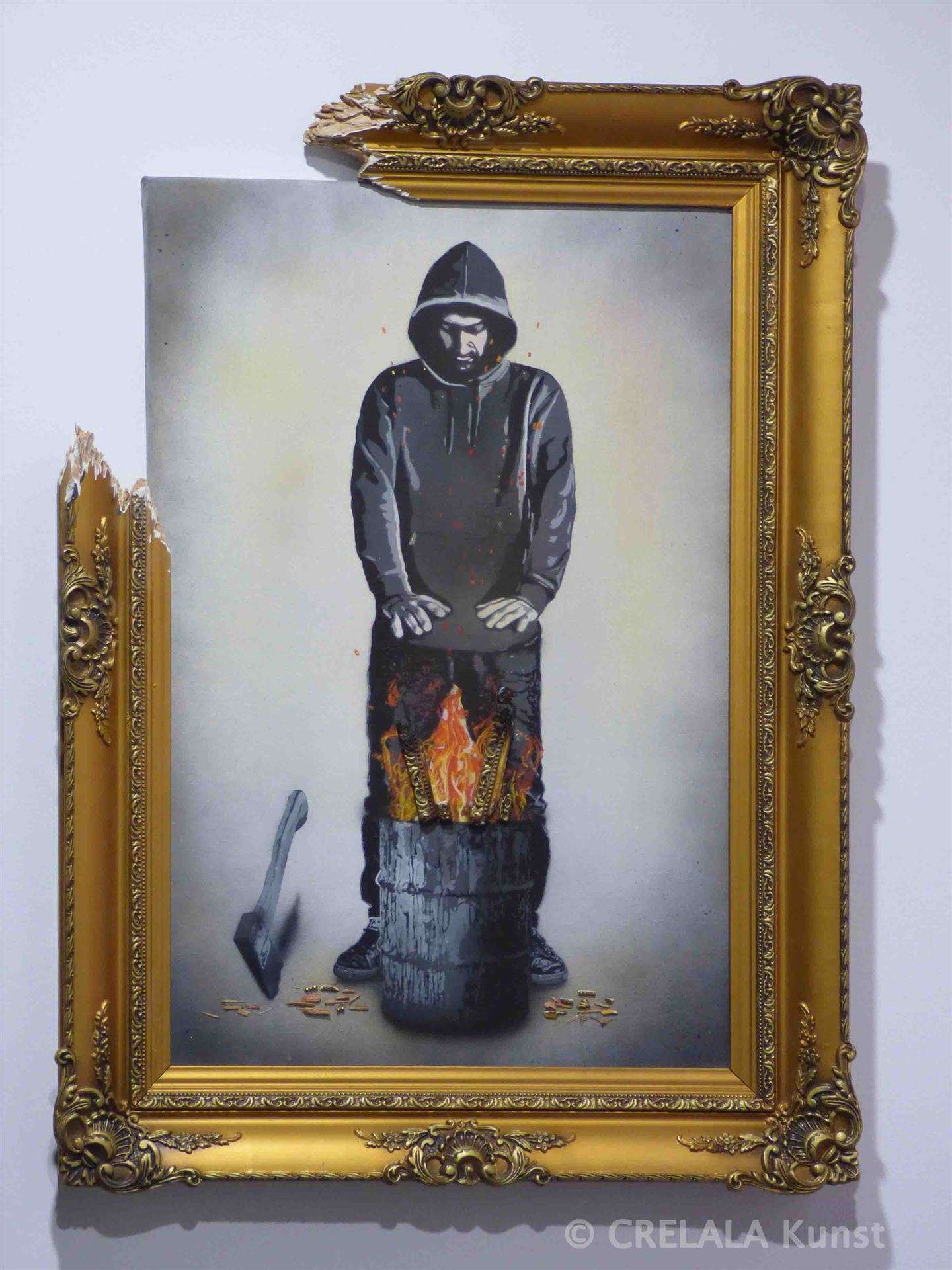 ILL erinnert an sie mit „Coldness“, im gebrochenen, barocken Rahmen. Erinnert an die an den Rand Gedrängten, irgendwo in den Randbezirken oder in der Unsichtbarkeit des Untergrunds Lebenden, die tagtäglich mit dem Überleben Kämpfenden. Sie hinterlassen Spuren und Zeichen an Hauswänden und überall dort, wo gerade scheinbar nicht hingeschaut wird. In der ersten Welt vielleicht nicht offensichtlich. Für die durchs Leben Hetzenden, vom Erfolg Getriebenen nicht wahrgenommen, aber sie sind da. Banksy unter ihnen, und viele andere, Namenlose, machen darauf aufmerksam.