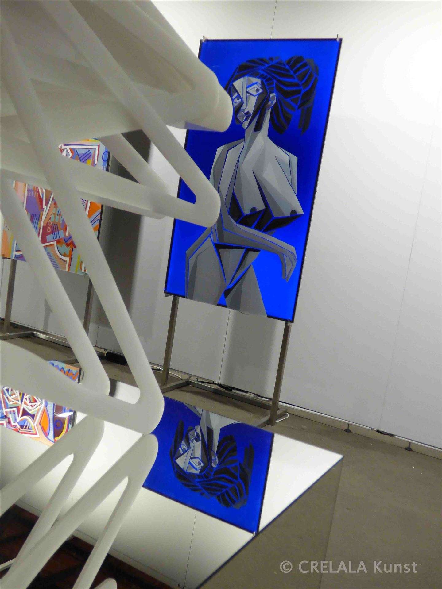 In Zusammenarbeit mit Georg Hendricks wird auch in die digitale Welt hineingespiegelt. Der DigiProfi“ entwickelt (Programme für) digitale Kunstwerke. Keine Anzeigen, oder Texte, wie man es aus der Öffentlichkeit gewohnt ist, sondern Kunstwerke, die sich immer wieder neu zeichnen. Vielleicht einem Zufallsprinzip folgend, so scheint es, nur die Form ist vorgegeben,… die Farben ändern sich (scheinbar) dynamisch! Eine kubistisch vermessene Nackte, nicht in Druckpunkte, nicht in Pixel Zerlegte, sondern vielfach geometrisch triangular Aufgeteilte, wird zum Kunstwerk, das Wartezeit verkürzen könnte. Zeit wird aus ihrer strengen Aufteilung herausgehoben, wenn man sich im Beobachten des Werkes verliert, und sich beginnt zu fragen, wie das eigentlich funktioniert. Welche Algorithmen stecken dahinter, welche theoretischen Methoden, welche infinite Elemente? Und noch während man schaut, mit dem Blick hin- und herspringend zwischen Realität und Spiegel, dreht sich links außen die Sternenlampe der Top-Designer VANORY aus Karlsruhe auf einer Spiegelsäule, passend zur Stimmung. „Bewegende Atmosphäre“ von vanory (vanory.com), die je nach mood mit unterschiedlichen Effekten beschaltet werden kann, und deren Besonderheit die Raffung des Materials ist, das aus Lichtpunkten funkelnde Sterne macht. Die umgebende transparente Hülle, vielleicht Glas, vielleicht Plexiglas, vielleicht Polymerketten,… man hat vergessen zu fragen, wird nicht mehr wahrgenommen. Ist nur noch Hülle für das geordnete Sternenlichtermeer, das in seinem Raum elektrisch angetrieben rotiert. Gespiegelt im "Spiegelturm" (von dontbeafraidofart), auf der es steht.