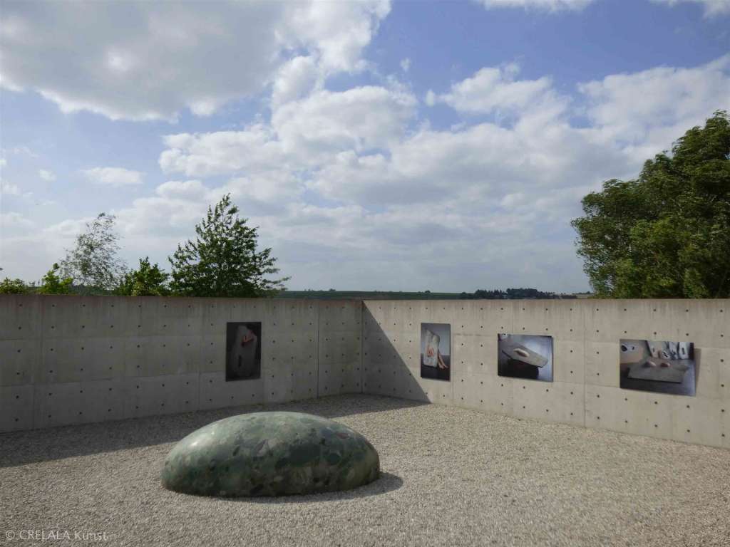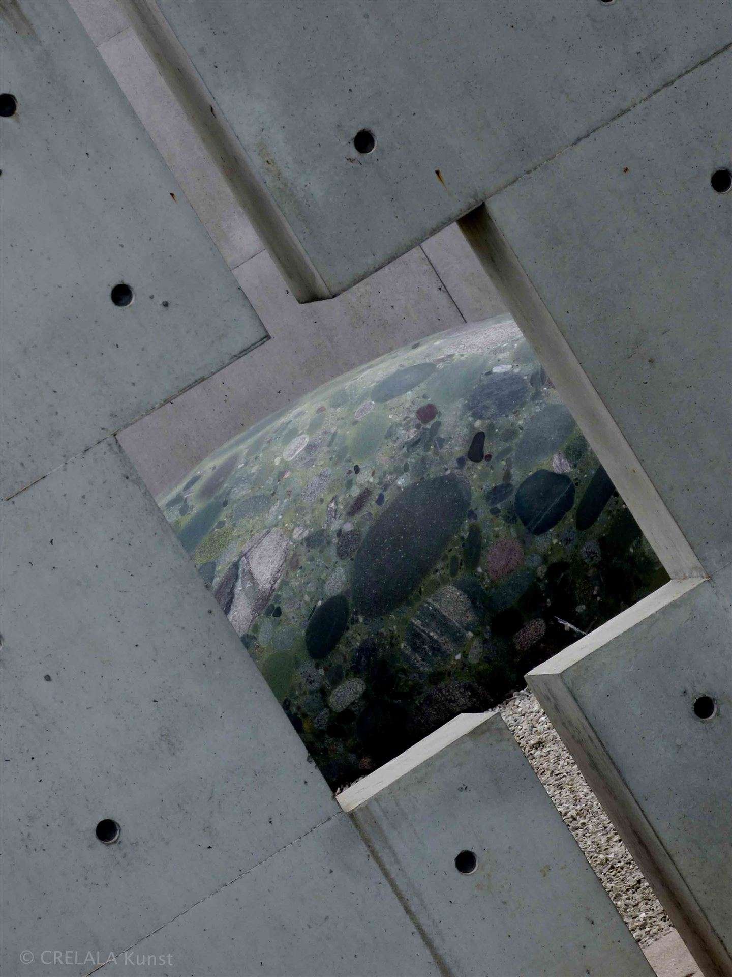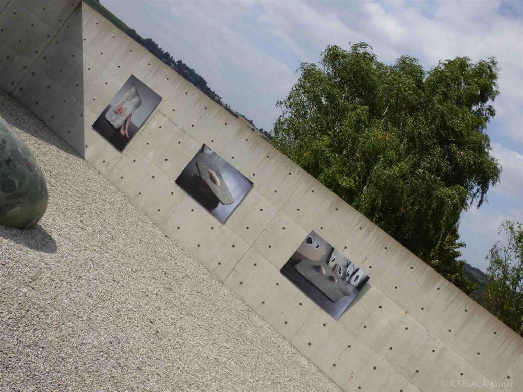 Wie das Kind im Museum vor Klimts „Der Kuss“ überlegt, beim verzweifelten lauten Insektensummen vorm Fenster,… wundern sich vielleicht auch Betrachter des Steinkokons aus Brasilianischem „Verde Marinace“ bei Kubach Wilmsen. Wie ein überdimensionaler geschliffener Strand- oder Flusskiesel liegt er da, in dem offenen Raum, unter freiem Himmel, der Findling, inmitten der Ausstellung „Körper“ aus großformatigen Fotografien von Milena Naef umgeben, hängend an Tadao Andos Betonwänden. - Abbildungen von Konstruktionen, die Stein und Mensch miteinander verbinden und scheinbar Unvereinbares, Getrenntes ineinander verschlungen zeigen.