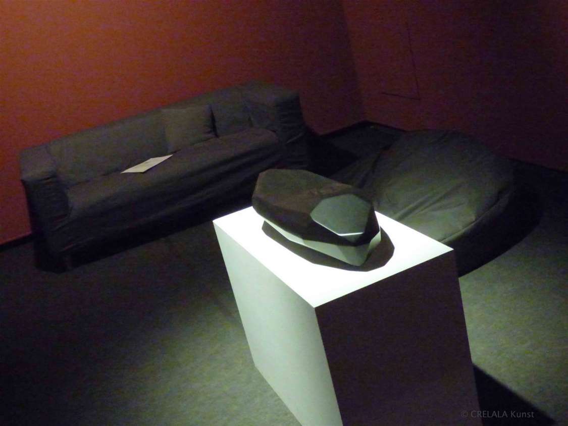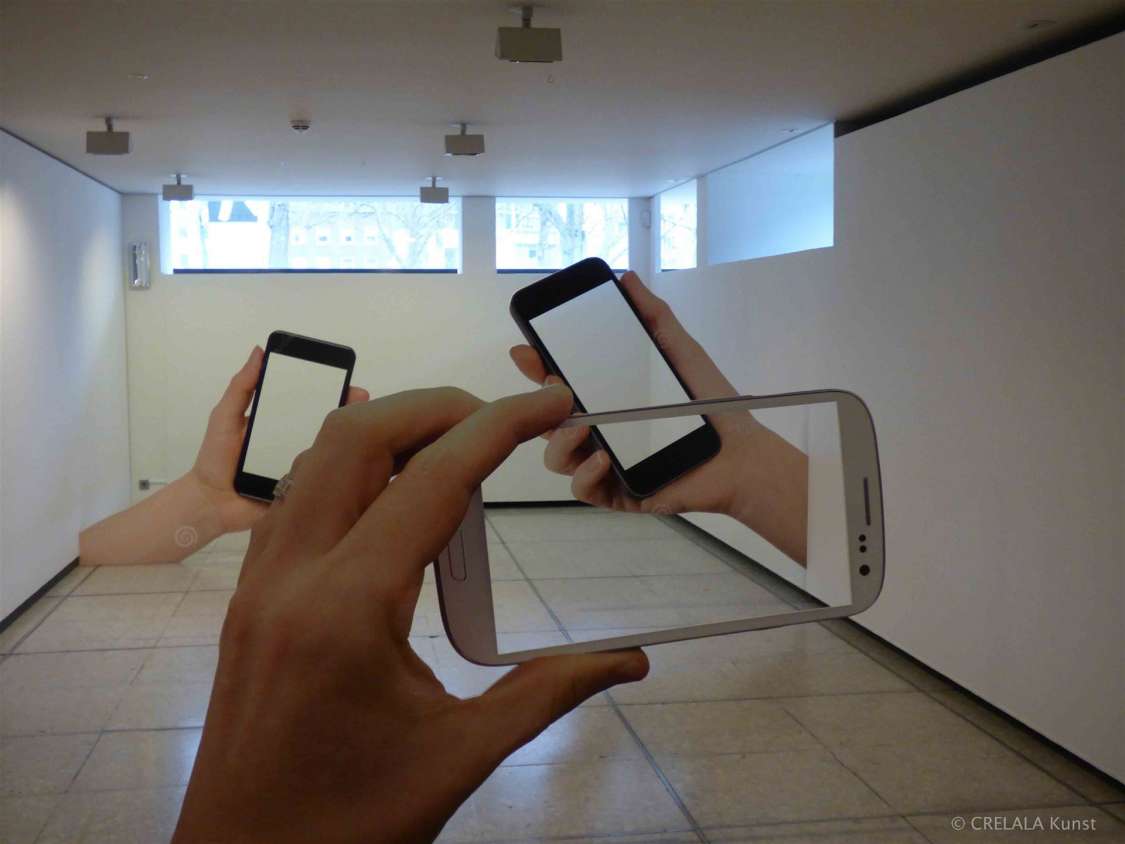 Noch vor dem Verlassen der Ausstellung sieht man diese Frage auf einem Flyer, aufgeworfen vor etwas, das aussieht, wie ein Portal. - Das Portal in die digitale Welt? Ein schwarzes Loch? Umrandet von blauen Strahlen, Wellen, Pulsen? - Aufgetan hinter schwarzem Glas? Einem schwarzen Brunnen gleich, wie dem aus der Sammlung Ströher, den Ulrich Rückriem 1986 aus schwarzem Granit erschaffen hat.