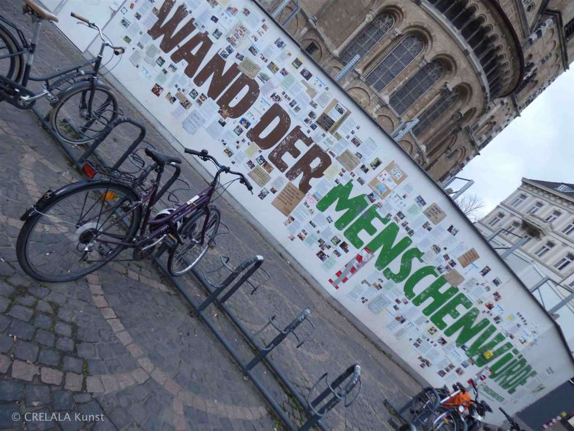 Kunst und Kirche, Kreative und spirituell Berührte, Wissenschaft und Glauben, nichts schließt sich aus, alles existiert nebeneinander, Leben Hand in Hand, ohne einander auszugrenzen, das könnte der Wunsch sein, den einer äußern würde, der von weit her staunend das ganze Szenario betrachtet und kurz vor Verlassen des menschenleeren Platzes noch einen letzten Blick zurück wirft auf die Wand der Menschenwürde. Mit Berichten und Texten, Aufrufen und Bildern und Gedanken zur Menschlichkeit aus aller Welt für EINE WELT!