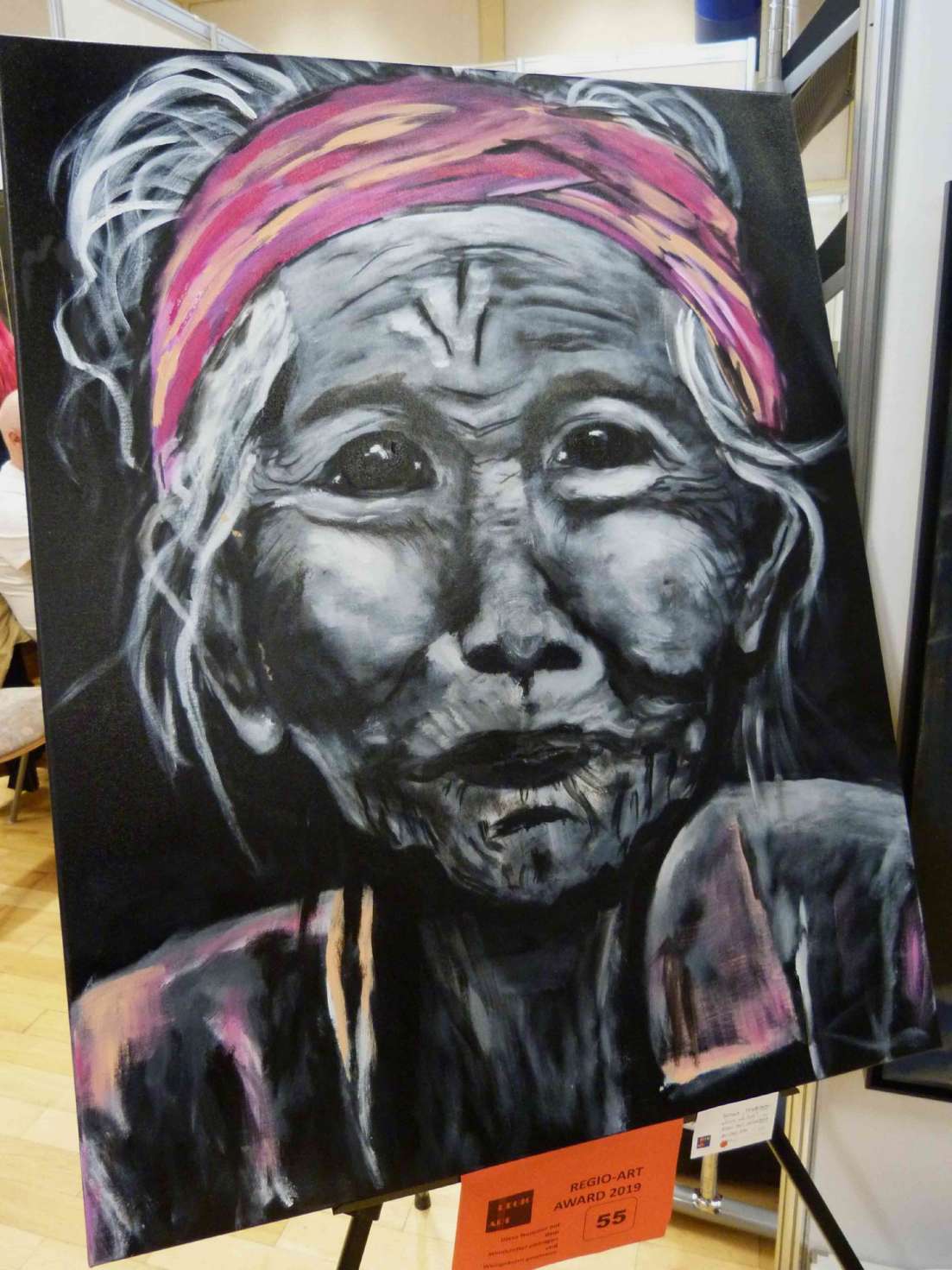 Bettina Pfirrmann - Die Schönheit im Antlitz obgleich offensichtlich betagt, asymmetrisch und "imperfekt", ja mit einer Löwennase, einem Katzengesicht, oder doch eher einfach nur mausgrau, die alte Dame trägt die Jugend noch in sich. Vielleicht symbolisiert durch das pinke Stirnband, vielleicht aber auch nur in unserer Interpretation. - Ein faszinierendes Portrait hat Bettina Pfirrman geschaffen, das mehr ausdrückt, als tausend Worte. Man ist gefangen in den schwarzen Augen und will mehr wissen über ein vielleicht bewegtes, vielleicht erfülltes, vielleicht glückliches Leben. Auf jeden Fall ein Leben, das Spuren hinterlassen hat und Mut macht. Das Erinnerungen weckt und verzaubert. Ein Zeichen, dass nicht nur Jugend ihren Reiz hat. Ja vielleicht sogar weniger, als das Alter, dem man das Leben und seine Spuren, bis zu der daraus resultierenden, für den Einzelnen individuell definierten, Weisheit ansehen kann. "Dinge zu malen, wie man sie denkt und nicht wie man sie sieht", das birgt wohl das Geheimnis der Kunst von Bettina Pfirrman.