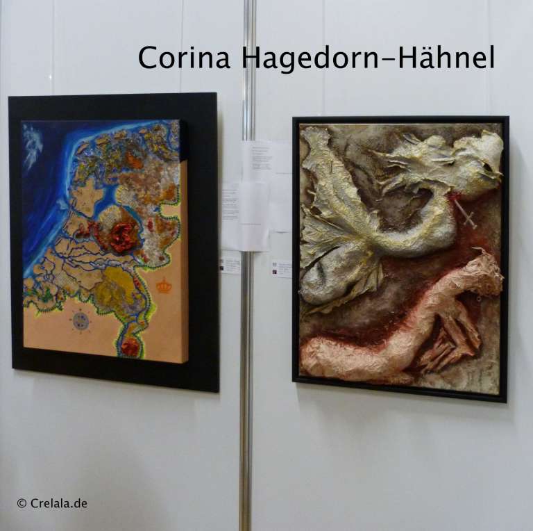 Corina Hagedorn Hähnel präsentierte ihren "Siegfried, der Drachentöter" und einen Blick aus den Wolken, zwei Werke, die ihr Können zeigen mit Formen, Farben und Materialien umzugehen. In ihren Werken verbindet die in Worms geborene Künstlerin das literarische Kulturgut mit ihrer Liebe zum Erschaffen von Ansichten. So vieles hat man in der Fotografie schon gesehen, vor allem die perfekten Ansichten der Erde aus dem All, dass man schwer noch etwas schaffen kann, das vergleichbar ist. Und doch gelingt es der Künstlerin mit ihrem Werk einen genaueren Blick darauf werfen zu wollen, so dass sich zeigt, was für Materialien sie in die Werke eingearbeitet hat.