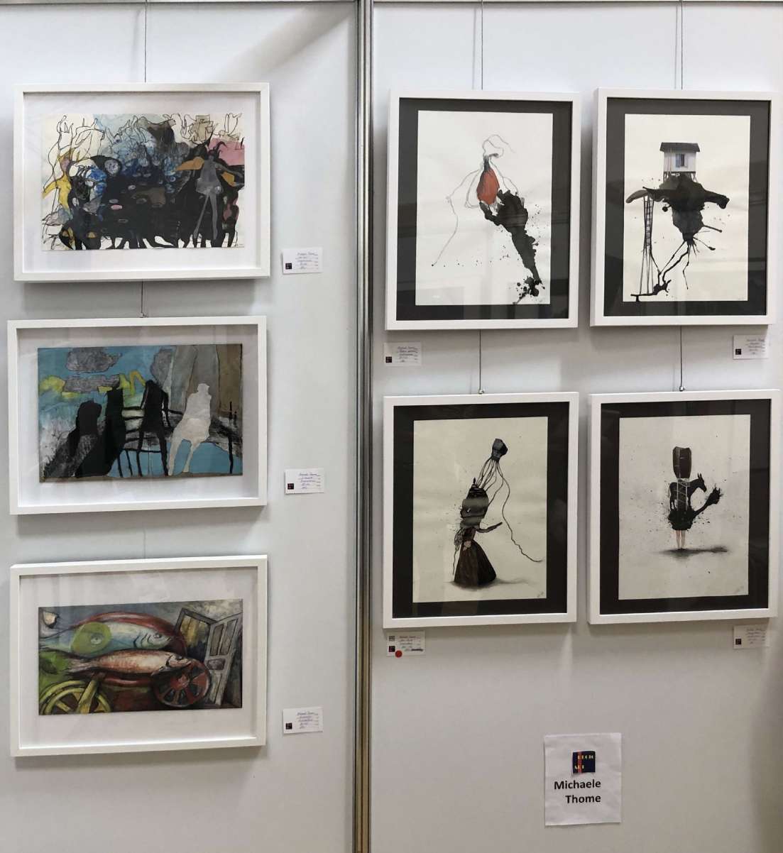 Michaele Thome hat die Tusche für sich entdeckt. Tuschekleckse, die als Collage erweitert werden und nach außen offen bleiben, um Raum zu lassen und nicht überladen zu werden. Zuerst ist immer der "Klecks", das erinnert an die Vorgehensweise des Künstlers Gregor Kalus, der seine prominenten Köpfe ohne Gesicht auch erst im zweiten Schritt hat entstehen lassen. Auf die gleiche Weise entstehen die Tuschewelten von Michaele Thome. Erst Klecks, dann wird entschieden, was entstehen soll. Es wird verdichtet, geklebt und gemalt, erweitert bis die Aussage fertig ist. Die Bilder sollen Spannungen erzeugen, die zu Assoziationen führen, welche am Ende nur der Betrachter