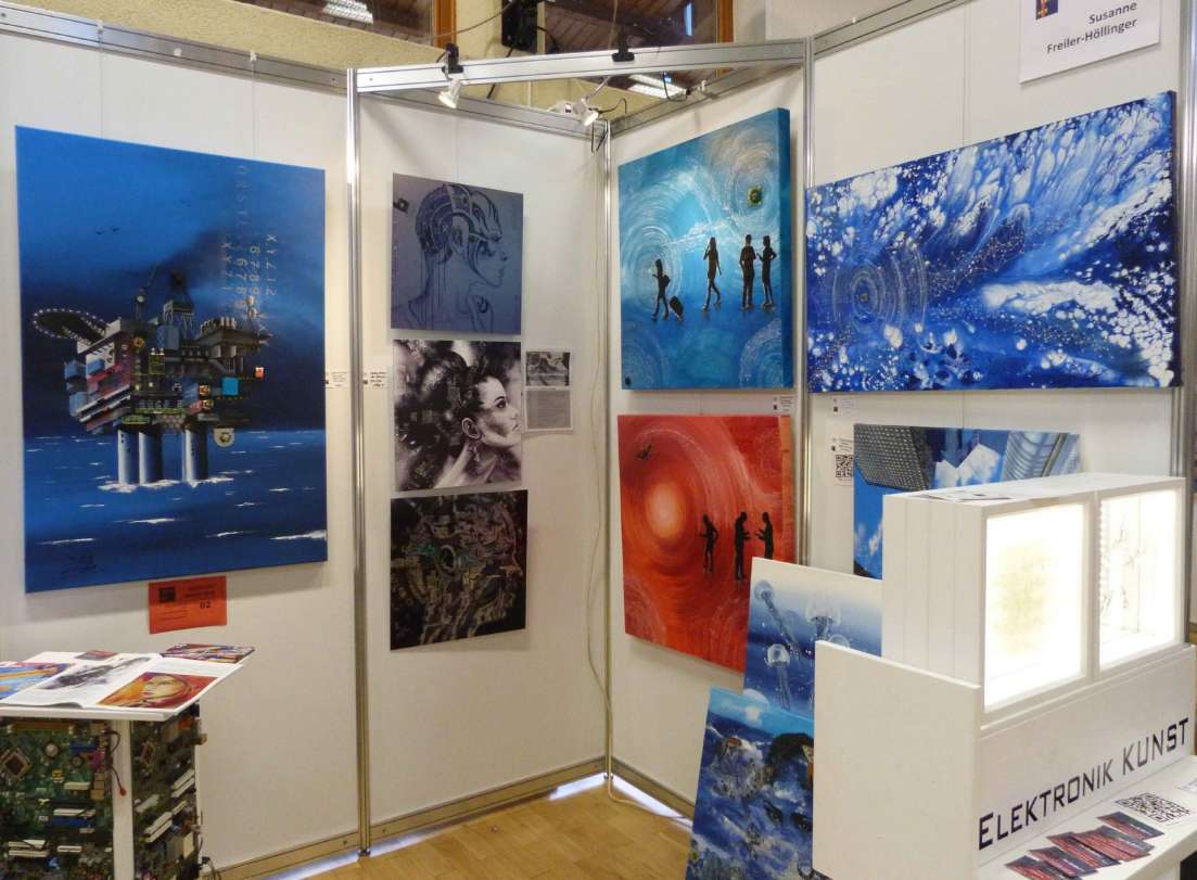 Was für eine Freude Susanne Freiler-Höllinger wiederzutreffen, die Expertin der Nullen und Einsen! Wer nicht weiß wohin mit seinem Elektroschrott ist bei ihr in guten Händen. Die Elektronik- Künstlerin hat sich der Verarbeitung alter Platinen verschrieben. Elektroschrott muss nicht in fernen Ländern die Natur zerstören, er kann auch wunderbar analog zu neuem Leben erwachen. Freiler-Höllinger verbaut Platinen und Logarithmen auf Leinwänden und plötzlich wird das digitale Erlebnis analog (be-)greifbar. Die großen Themen der Zeit finden bei ihr Berücksichtigung und man erkennt Zusammenhänge. Ob es ein Appell zum Umdenken ist vielleicht. Jeder muss sich selbst fragen, was zählt im Leben.
