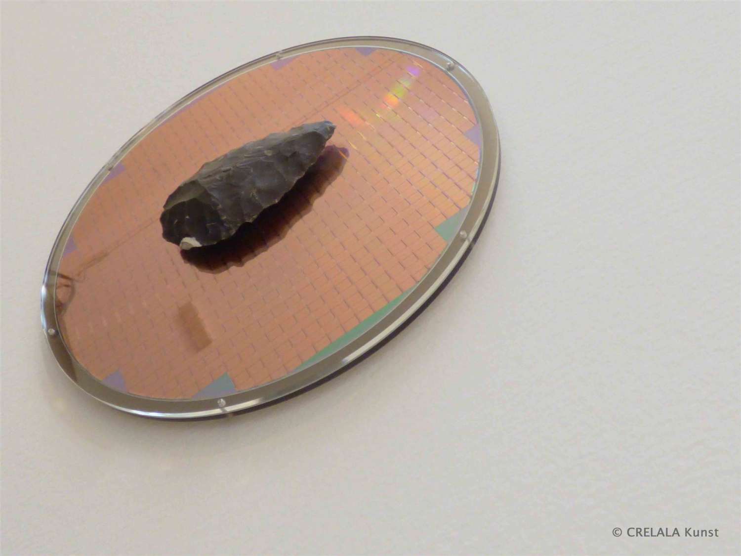 Universe, Metaverse, Holoverse, Mediaverse,… die Vielzahl der Welten können Menschen sich dank Digitalisierung und Visualisierung inzwischen gut vorstellen. Der Mensch erscheint im Holozän, weiß man,… Mit dem Faustkeil durch die Welt ziehend, jagend und sammelnd, als Höhlenmensch und Nomade, bevor er sich Land urbar macht und Tiere domestiziert. Bevor er das Feuer bezwingt und das Rad erfindet. Und Troika schlägt die Brücke von der Urzeit zur Gegenwart, mit einem Faustkeil aus Feuerstein auf einem Wafer, einer von unzähligen gesägten Einzelplatten, aus gezogenen Einkristallstäben, z.B, aus Silizium, aus denen durch nachfolgende Oberflächenbehandlung mittels Ätz- und Polierverfahren Halbleiterrohplatten werden. TROIKA ist ein kollaboratives Künstler:innen-Kollektiv aus London, das den Zustand der Welt in Kunst reflektiert, und verdeutlicht wie der technologische Fortschritt und die menschliche Realität sich gegenseitig beeinflussen. Die Künstler untersuchen, wie Informationsübermittlung in die physische Realität übergeht. International anerkannt visualisieren sie die energiewirtschaftlichen Auswirkungen auf ihr Umfeld und übersetzen z.B. in Algorithmen, was Überwachungskameras bei Naturkatastrophen oder -phänomenen aufzeichnen, wie die Serie „Irma watched over by machines“, 2022 zeigt. Die Serie „Fahrenheit 251“ von 2014 veranschaulicht eindrucksvoll die Auswirkungen elektrischen Stroms in speziell behandeltem Papier, nach Aufbringen auseinanderliegender, entgegengesetzter Pole. Kathode und Anode. Experimentelle Arbeiten, wie im Physikunterricht, nur mit Ergebnissen außergewöhnlich ästhetischer Schönheit.