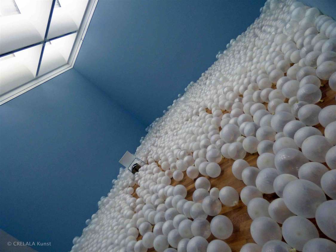Rechts von der Nische die „Rauch-Säule“ von Milanova und Lindner, im Rücken ein Raum voller weißer Ballons, aufgepustet vielleicht mit der Luft aus den Lungen eines Menschen. Lebensatem, eingepfercht in Gummi-/Kunststoff-/Plastikhüllen, Elastomere, Ballons, verteilt wie zum Bällebad bei einem Kindergeburtstag.