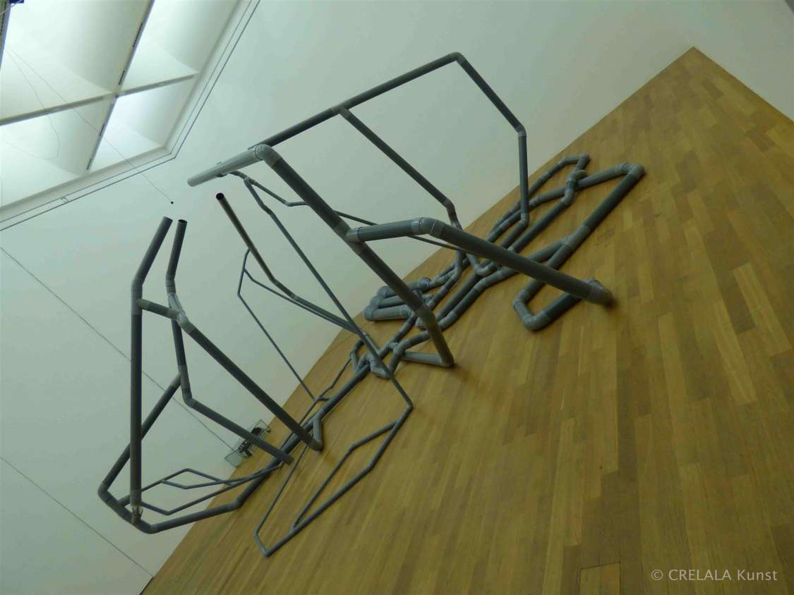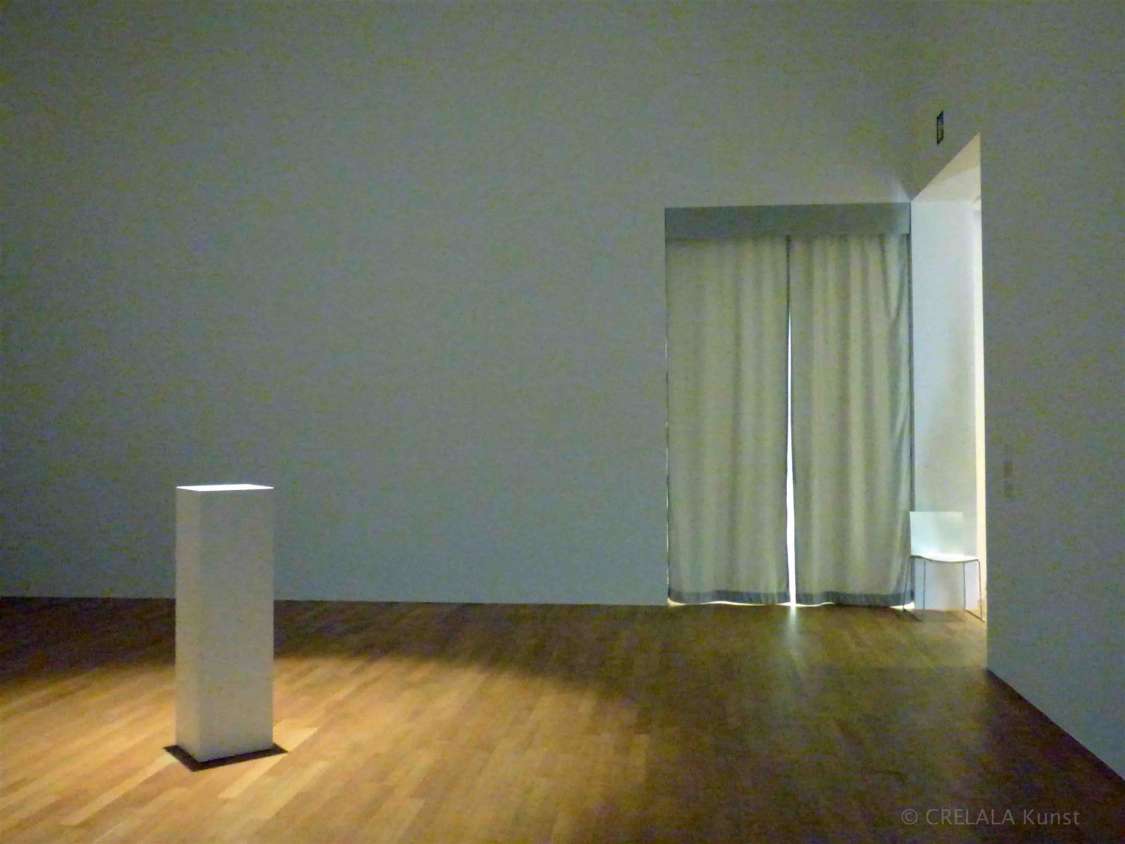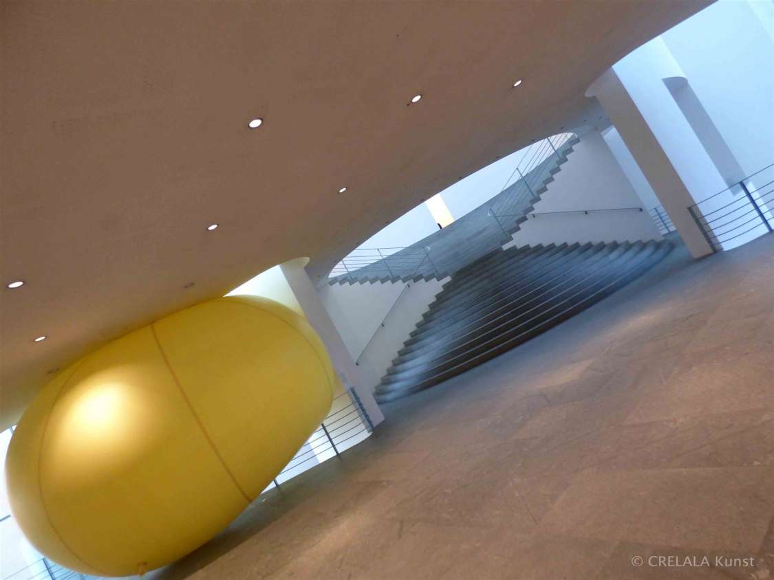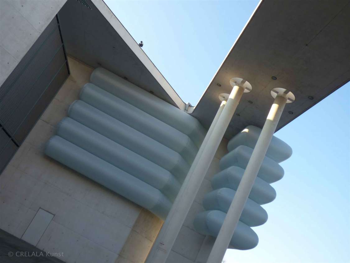 Links von der Nische bunte, überdimensionale Palmen, aufgeblasen wie man es von Hüpfburgen kennt. Von Kindergeburtstagen oder Kinderfesten. Otto Pienes Werk von 2014 nennt sich „Langen Stars“. Palmen sind es wohl also nicht. Otto Piene ist Mitbegründer der Gruppe ZERO und seine Sky-Art-Projekte sind schon seit den 1960ern spektakulär. Seine sternförmigen Objekte aus Spinakertuch fallen in sich zusammen, wenn die Luft aus dem Gebläse nicht mehr strömt. Die beschleunigten „Luft-Teilchen“ fehlen.
