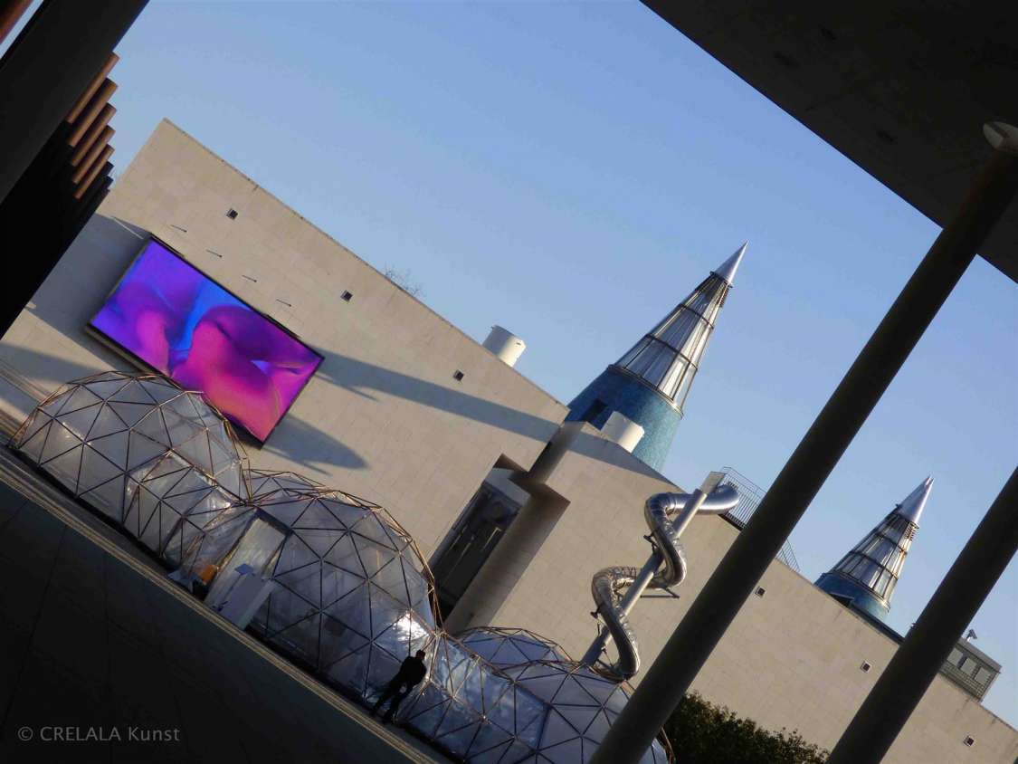 Und draußen vor dem Kunstmuseum sind kleine Kuppeln, Sphären mit unterschiedlicher Luft-zusammensetzung aufgestellt. Michael Pinskys „Pollution Pods“, von 2017. Erst denkt man an Raucherkuppeln, zum Schutz von Menschen vor Menschen, oder freundlicher gedacht: vor Kälte, aber tatsächlich sind es Nachbildungen der Luft von fünf über die Welt verteilten Städten, mit je einer spezifischen Zusammensetzung aus Ozon, Feinstaub, Stickstoffoxid, Schwefeldioxid und Kohlenmonoxid.