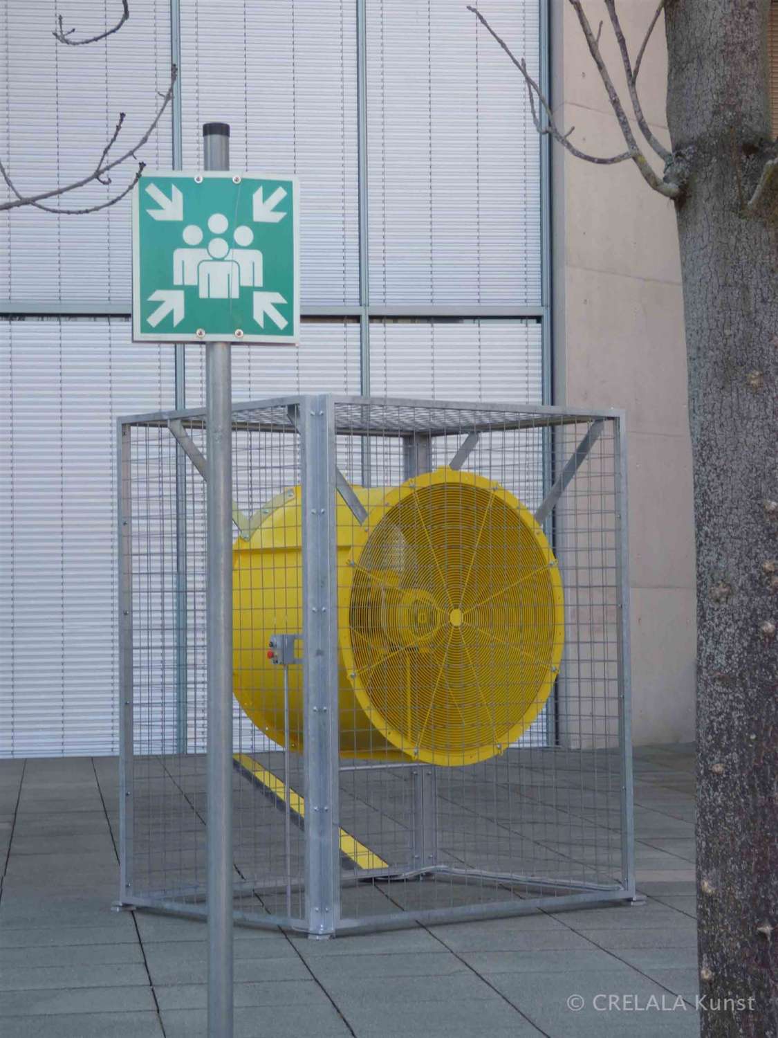 Klimaanlagen, Luftbefeuchter, Windmaschinen, … nicht immer bemerkt man, wenn die Luft technisch umgewälzt wird, um dem Menschen das Atmen so angenehem wie möglich zu machen. Vielleicht nimmt man die Arbeit der Anlagen wahr, vielleicht ist sie auch nicht stark genug und man spürt nichts, aber in allen modernen Gebäuden wird dem Raumklima besondere Aufmerksamkeit gewidmet, nicht zuletzt auch unter gesundheitlichen Aspekten. Das Spüren eines Lufthauchs, Nina Canell & Robin Watkins haben sich dieser Idee ebenfalls gewidmet. Als ob ein Geist in der Luft schwebte. Tatsächlich ist es aber nur eine Belüftung.