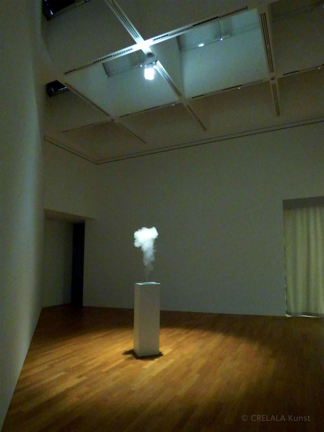 Das Bild einer Rauch-Wolke erinnert an das Werk einer Wolke in einem Rahmen. Von Karen Shahverdian. – Hier: KEIN Rahmen. - Keine Box. - Kein Kasten! – Keine Begrenzung. - Eine Säule unter einer Lichtsäule. Nichts darauf. Man wartet. Wartet, weil man weiß, was kommen muss. Wartet auf den Moment. - Wie viele Minuten vergehen? Und dann ist er da. Der Moment. - „Paff“ – Und binnen Sekunden verteilt sich die Rauchwolke im Raum.