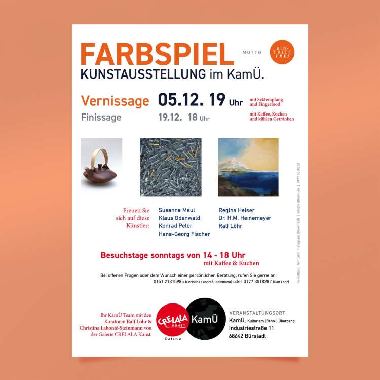 Unter dem Titel „Farbspiel“ öffnet am 05. Dezember 2025 eine neue Ausstellung im KamÜ, die zwei Wochen lang die Vielfalt und Ausdruckskraft zeitgenössischer Kunst in den Mittelpunkt stellt. Kuratiert von Christina Labonté-Steinmann (CRELALA Kunst-Bensheimer Galerie) und Ralf Löhr(Künstler) zeigt die Schau, wie unterschiedlich Künstlerinnen und Künstler mit Farbe, Licht und Struktur arbeiten.