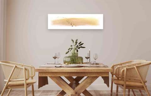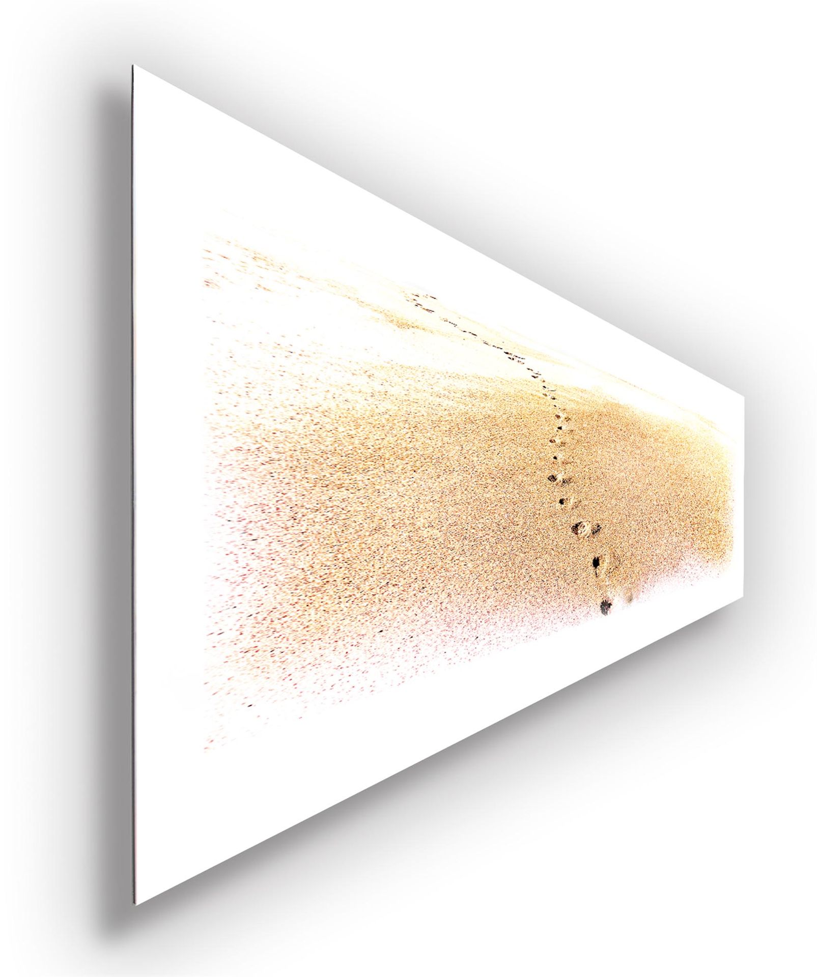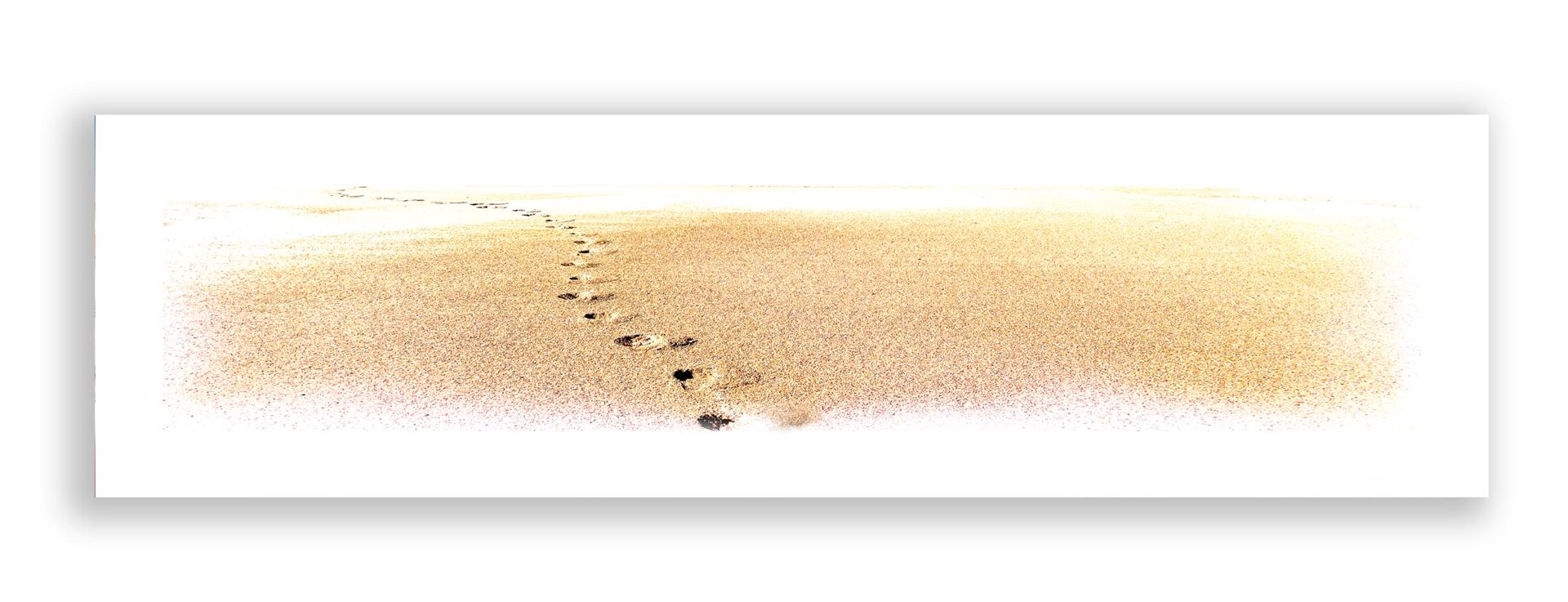 Das Kunstwerk "Spuren im Sand" ist eine Fotografie in Aquarelloptik, daher der Begriff Aquagrafie. Das Kunstwerk ist auf Aquarell-Papier gedruckt, auf Alu-Verbundplatte aufgezogen und hat ein Außenmaß von 100 cm 30 cm x 0,3 cm. Dieses Werk hat eine limitierte Gesamtauflage von 3 Stück.