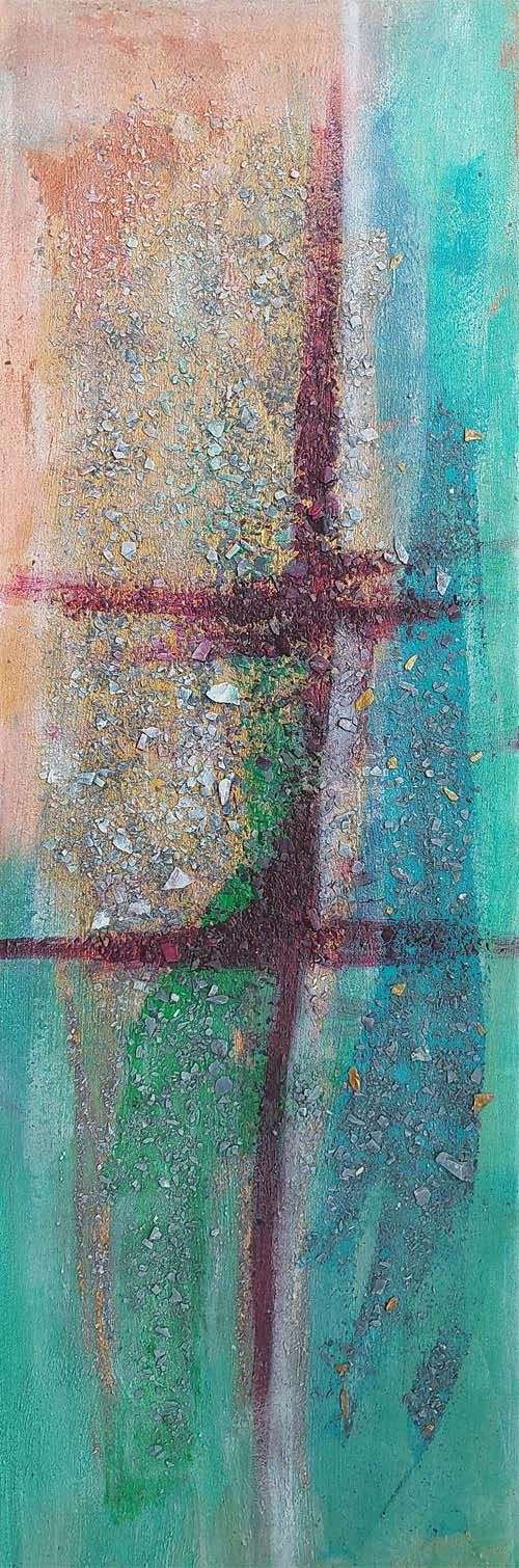 Das Kunstwerk "Der Neubeginn" wurde in Mixed Media und Acryl auf Leinwand gemalt. Das Außenmaß des Kunstwerkes beträgt 30 cm x 90 cm x 1,6 cm.