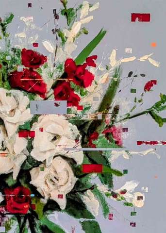 Das Kunstwerk "Glitch Flowers 4" wurde in Acryl auf Leinwand gemalt und hat ein Außenmaß von 100 cm x 120 cm x 4,5 cm .