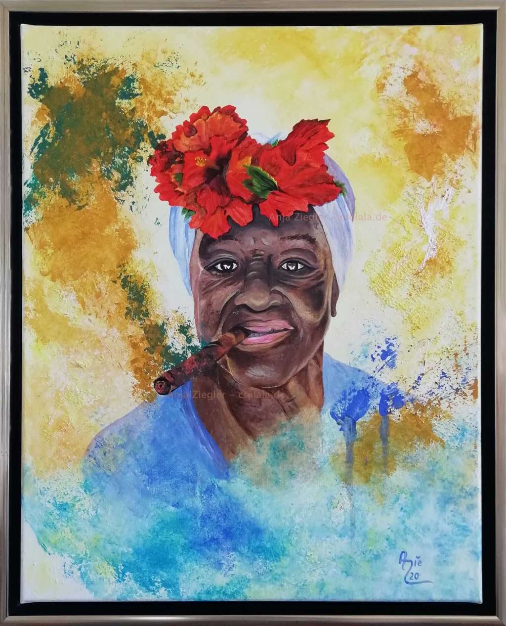 Das Kunstwerk "Havanna" wurde in Acryl auf Leinwand gemalt. Das Unikat wird gerahmt in einem zweifarbigen Schattenfugenrahmen (schwarz/gold) zum Verkauf angeboten. Das Außenmaß dieses Unikates beträgt 64 cm x 54 cm x 3,5 cm.