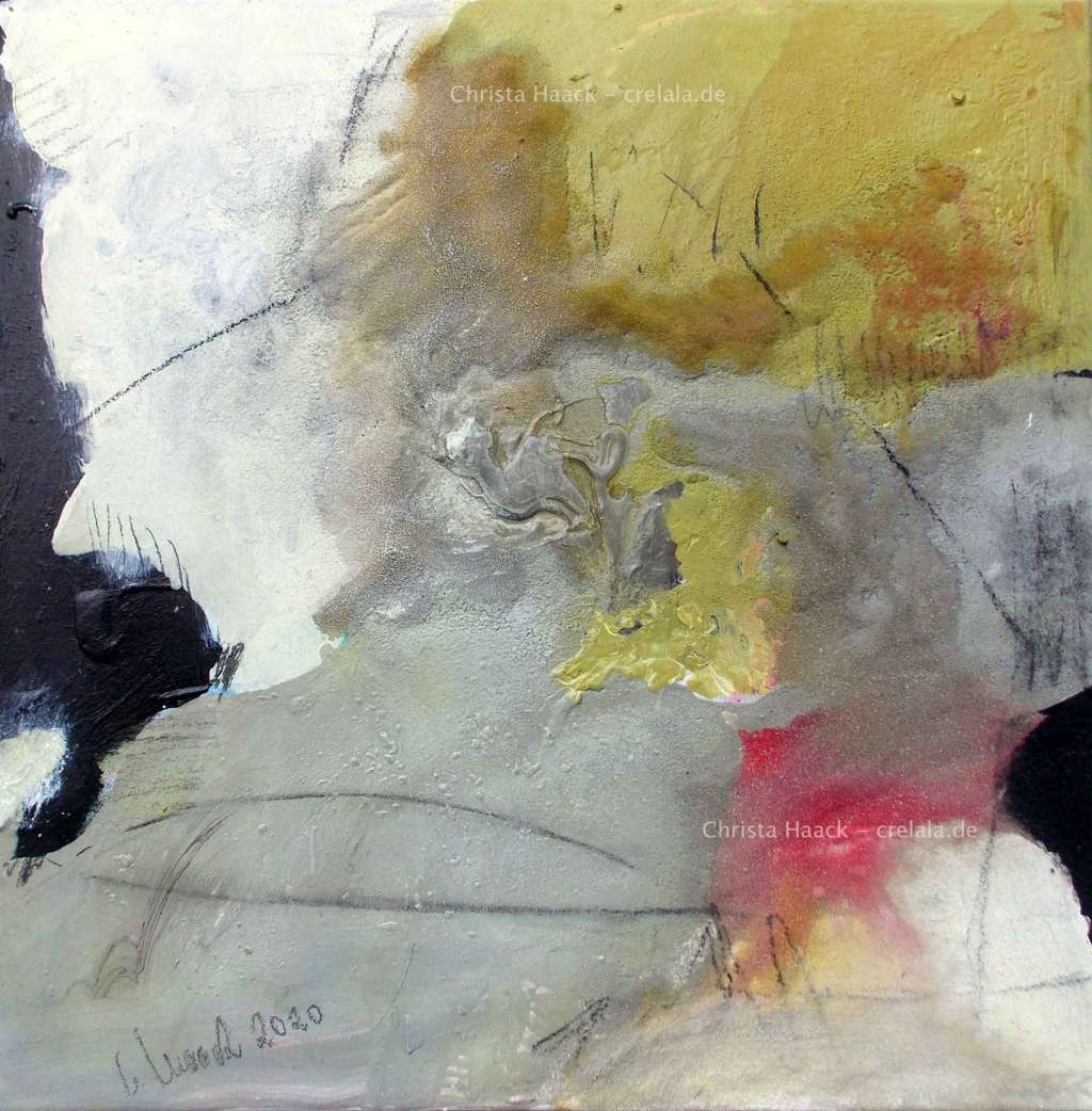 Struktur und Aussage des Bildes ergeben sich unbewusst und intuitiv aus dem Malprozess. Meine persönliche Inspiration waren die Sonderfarben Anthrazit, Grün, Altrosa und Weiß auf dem meist grauen Hintergrund.