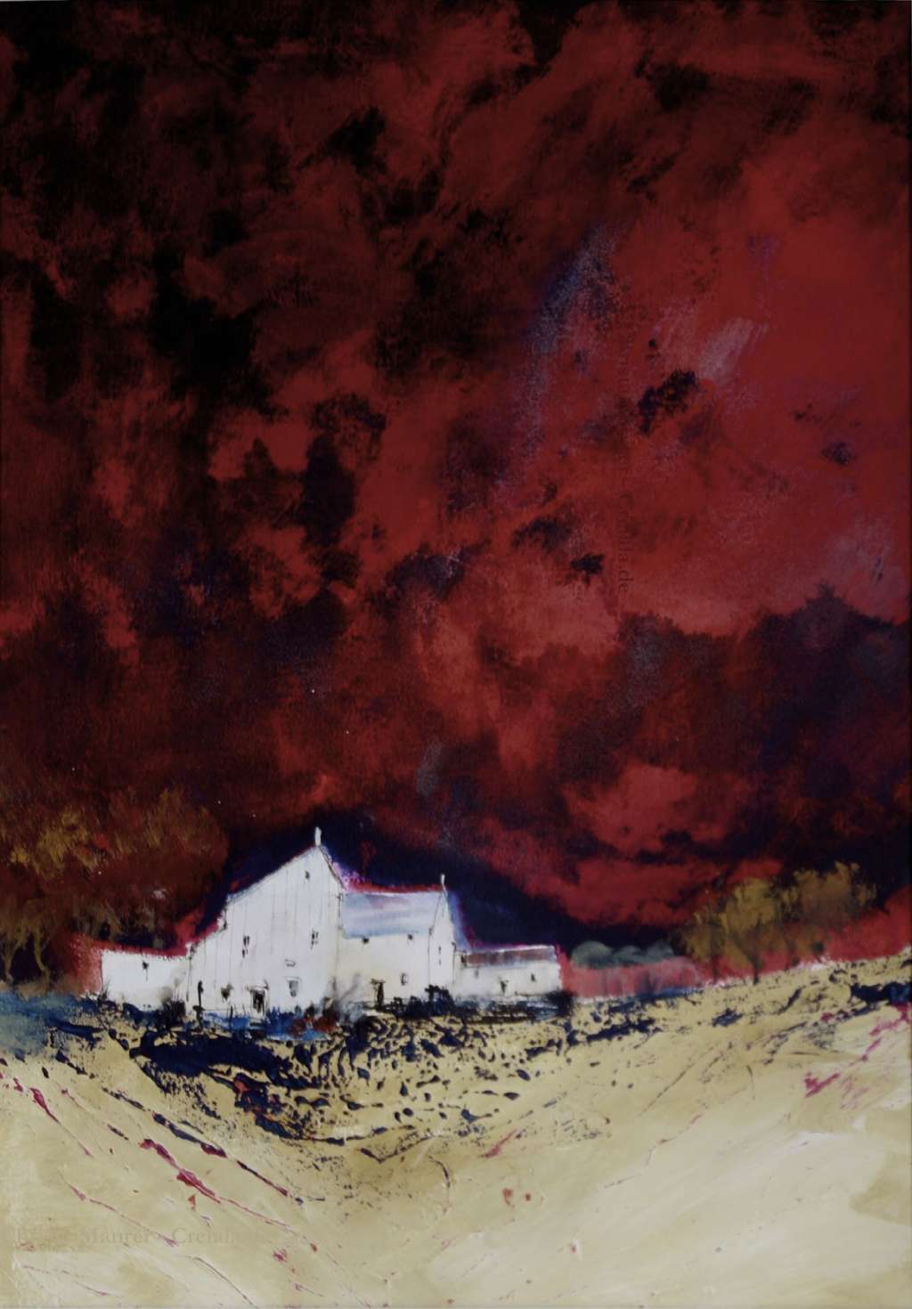 Das Kunstwerk "Feuerhimmel" wurde in Acryl auf Aquarellpapier gemalt. Das Außenmaß dieses Unikates beträgt 70 cm x 50 cm.