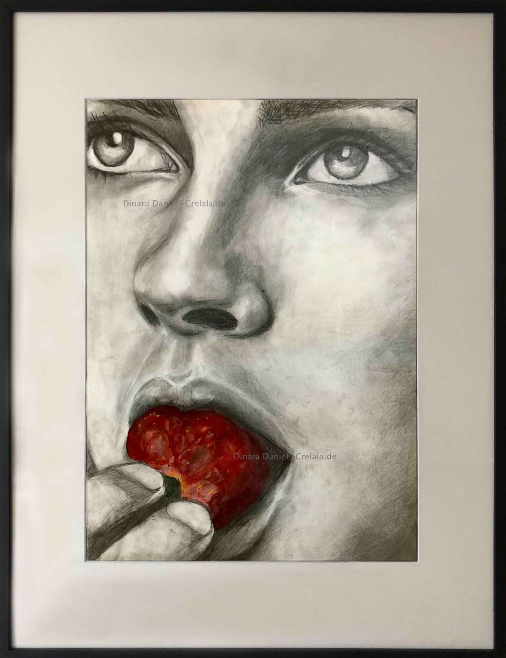 Das Kunstwerk "Das Mädchen das Erdbeeren liebt" wurde in Bleistift und Aquarell auf Papier gemalt. Das Unikat wird in einem Glasrahmen mit Passepartout zum Verkauf angeboten. Das Außenmaß dieses Unikates beträgt 58 cm x 42 cm cm und gerahmt 81 cm x 61 cm x 2 cm.