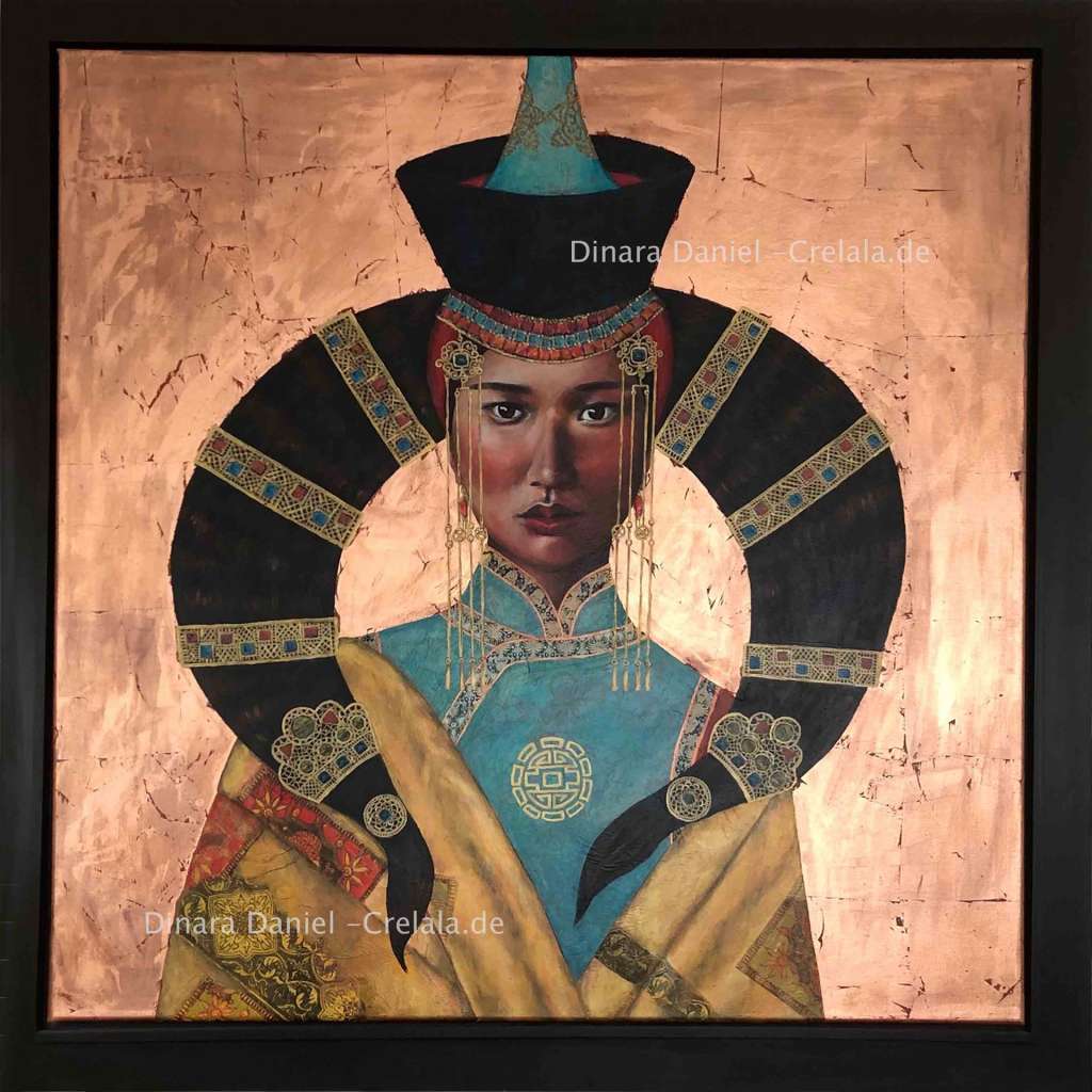 Das Kunstwerk "Mongolian girl" wurde in Mischtechnik auf Leinwand gemalt. Das Unikat wird gerahmt zum Verkauf angeboten. Das Außenmaß dieses Unikates beträgt 90 cm x 90 cm x 4 cm und gerahmt 102 cm x 102 cm x 4 cm.