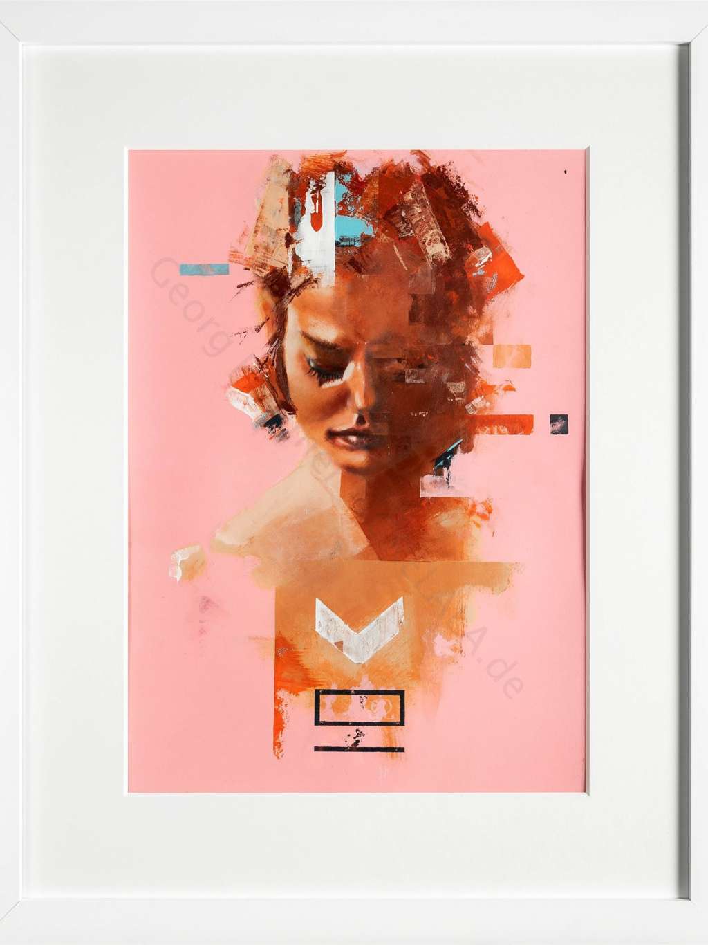 Das Kunstwerk "No Surrender-PINK" wurde in Acryl auf Papier gemalt. Das Unikat wird gerahmt (Glasrahmen) mit Passepartout zum Verkauf angeboten. Das Außenmaß dieses Unikates beträgt 82 cm x 67 cm x 4 cm.