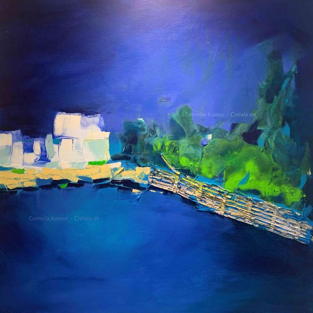 Kaufen Sie jetzt Malerei online bei CRELALA KUNST. "Das Haus am See" ein abstraktes modernes, zeitgenössisches Gemälde in Acryl und Mixed Media auf Leinwand von Cornelia Komor.