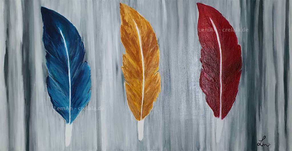 Das Kunstwerk "Feder 3" wurde in Acryl auf Leinwand gemalt. Das Außenmaß dieses Unikates beträgt 120 cm x 60 cm x 4 cm.