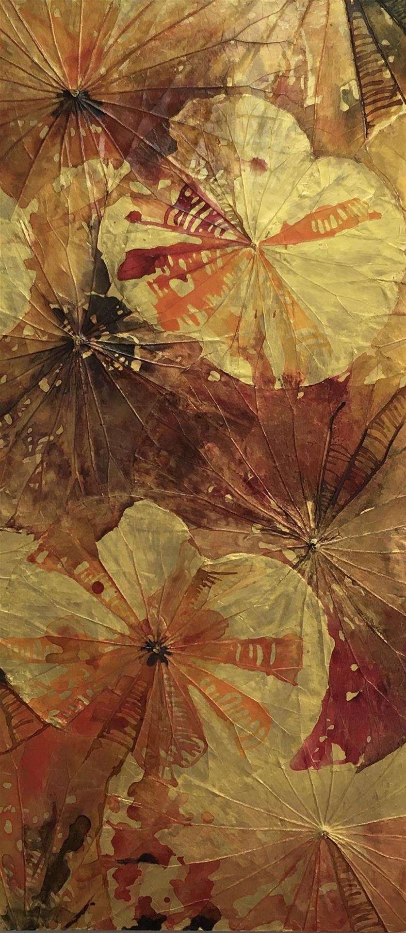 Das Kunstwerk "Goldene Stunde II" wurde mit spezieller thailändischer Lotusmalerei erstellt. Das Kunstwerk ist mit Acrylfarbe, Antiktusche und Mixed Media auf einem Lotusblatt auf Leinwand gemalt. Die Ränder der Leinwand sind schwarz gehalten. Das Kunstwerk kann sowohl hochkant als auch quer gehängt werden. Das Außenmaß dieses Unikates beträgt 90 cm x 40 cm x 4 cm.