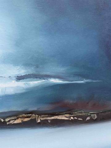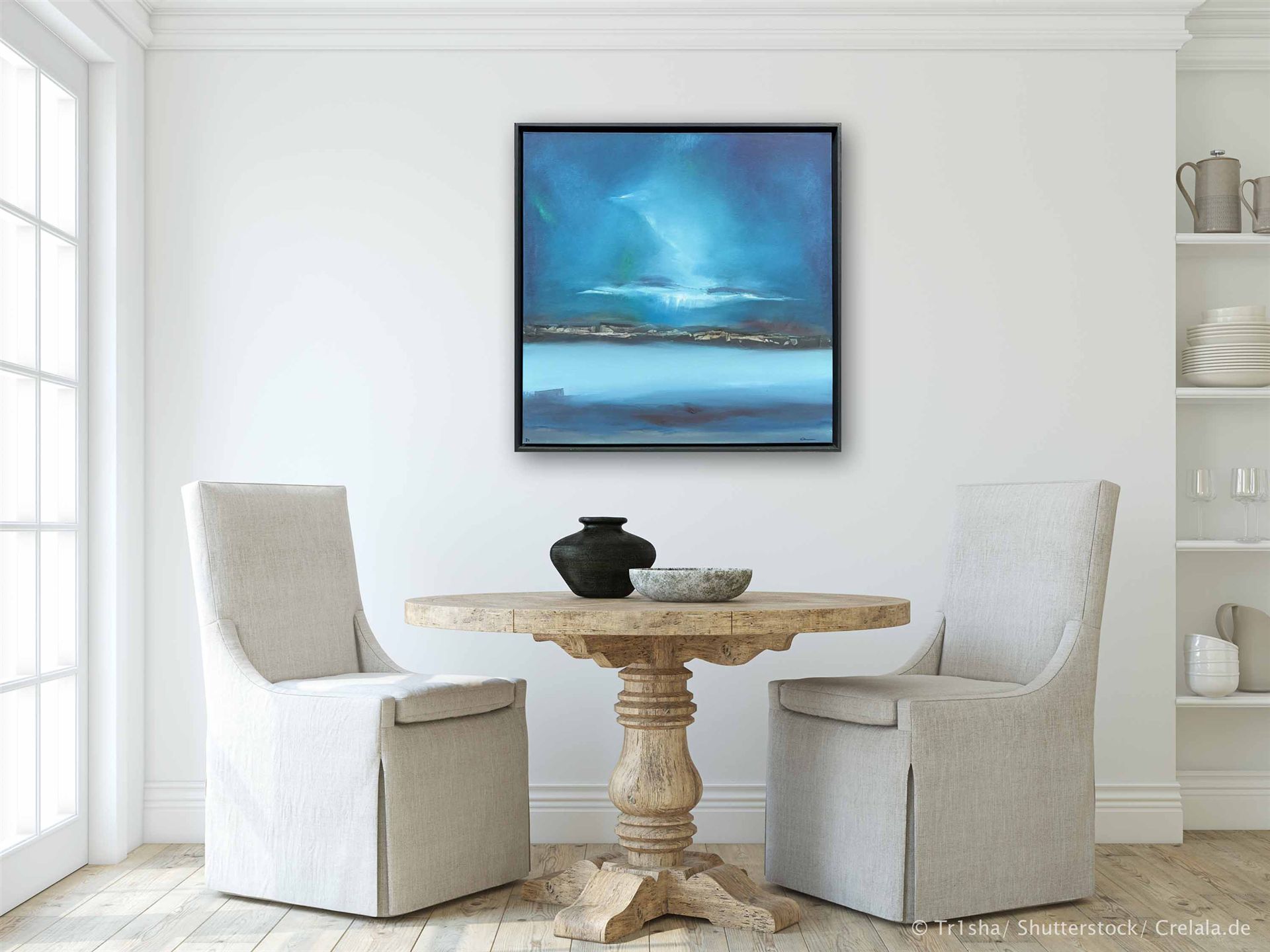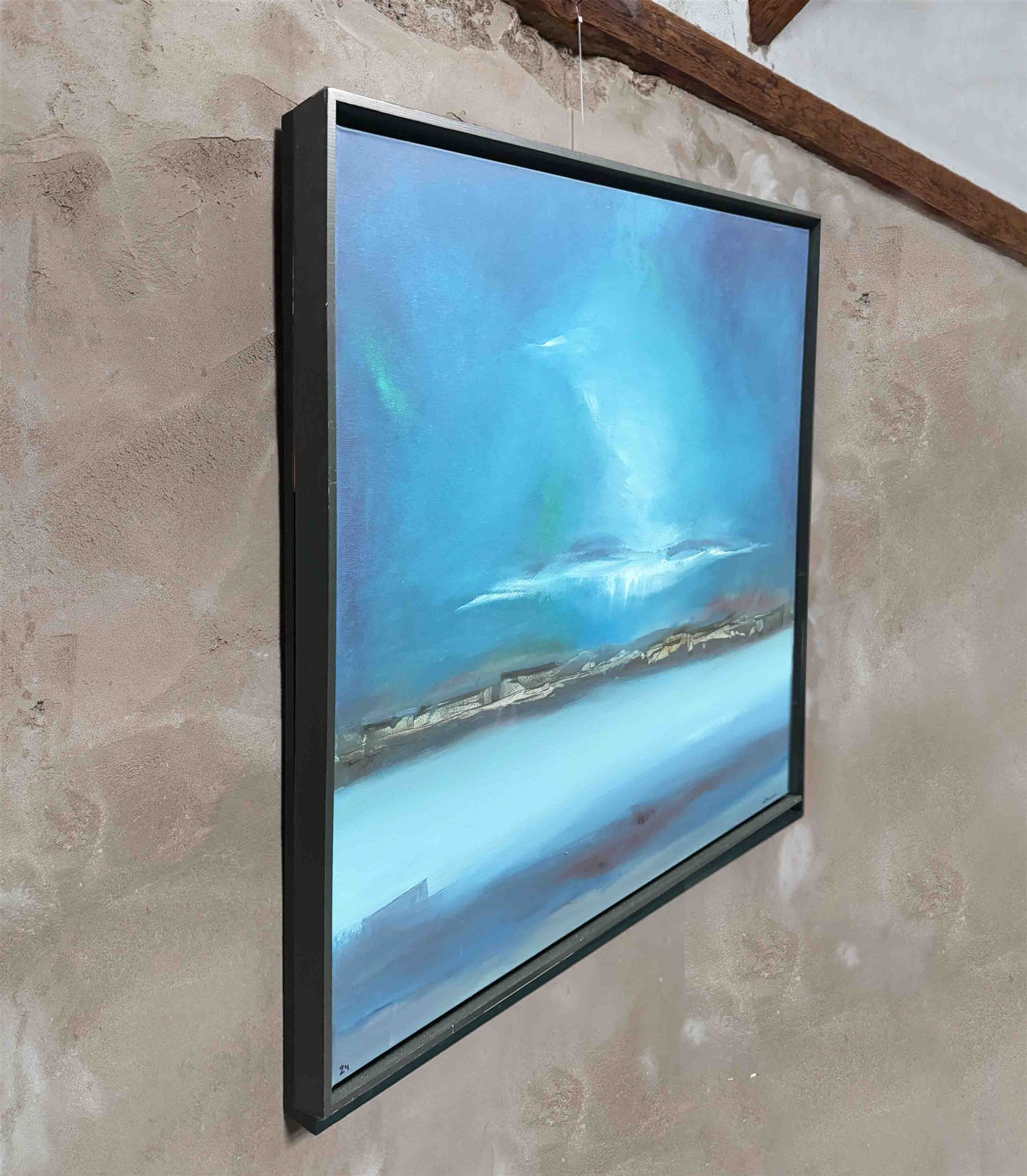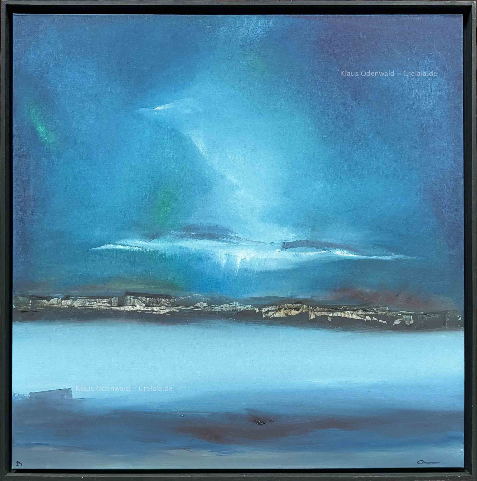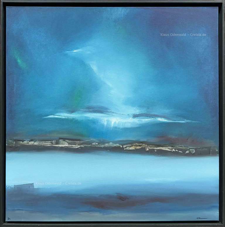 Das Kunstwerk "Nordlicht" wurde in Öl auf Leinen gemalt. Das Gemälde wird gerahmt zum Verkauf angeboten und hat ein Außenmaß von 90 cm x 90 cm x 4cm