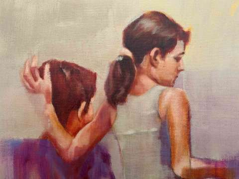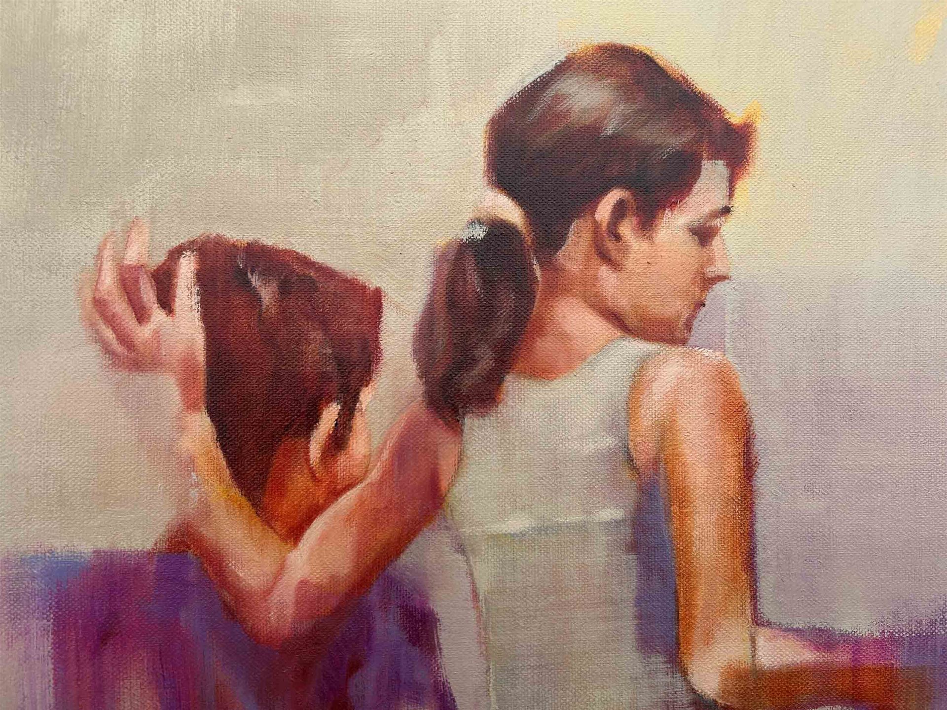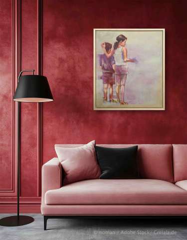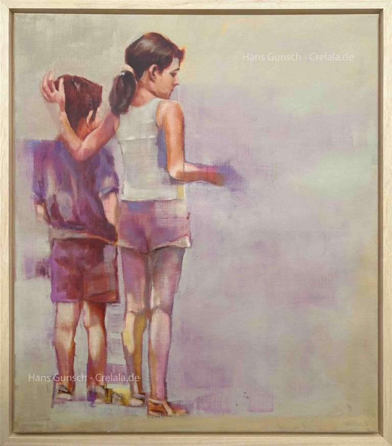 Kaufen Sie jetzt Ölbilder bei CRELALA KUNST. "Geschwister 1" ein modernes, figuratives Gemälde in Öl auf Leinwand, gerahmt.