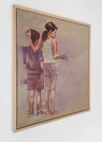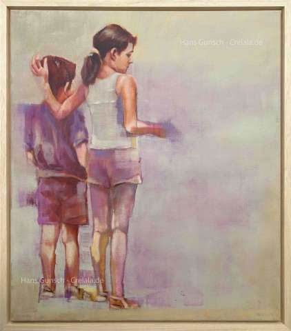 Das Kunstwerk "Geschwister 1" wurde in Öl auf Reinleinen ca. 430 g pro qm gemalt. Das Gemälde wird gerahmt zum Verkauf angeboten und hat ein Außenmaß von 75 cm x 85 cm x 4 cm.