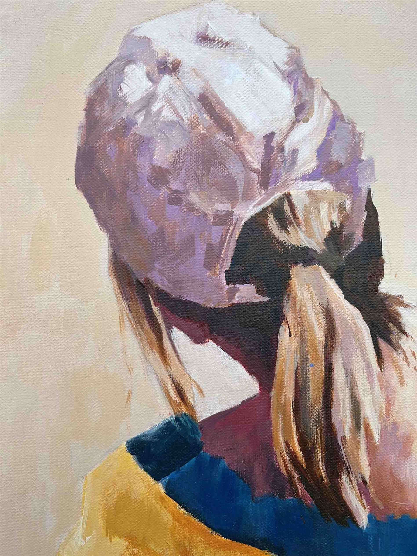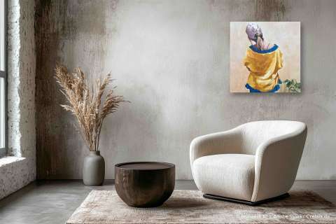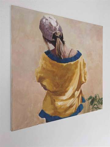 Das Kunstwerk "Besucherin" wurde in Öl auf Reinleinen ca. 430 g pro qm gemalt. Das Gemälde hat ein Außenmaß von 80 cm x 80 cm x 4 cm.