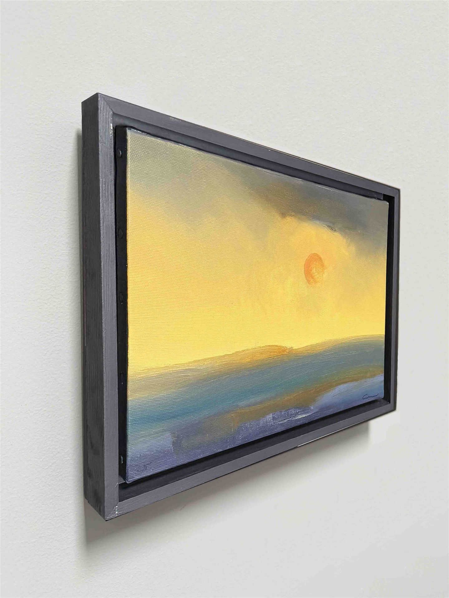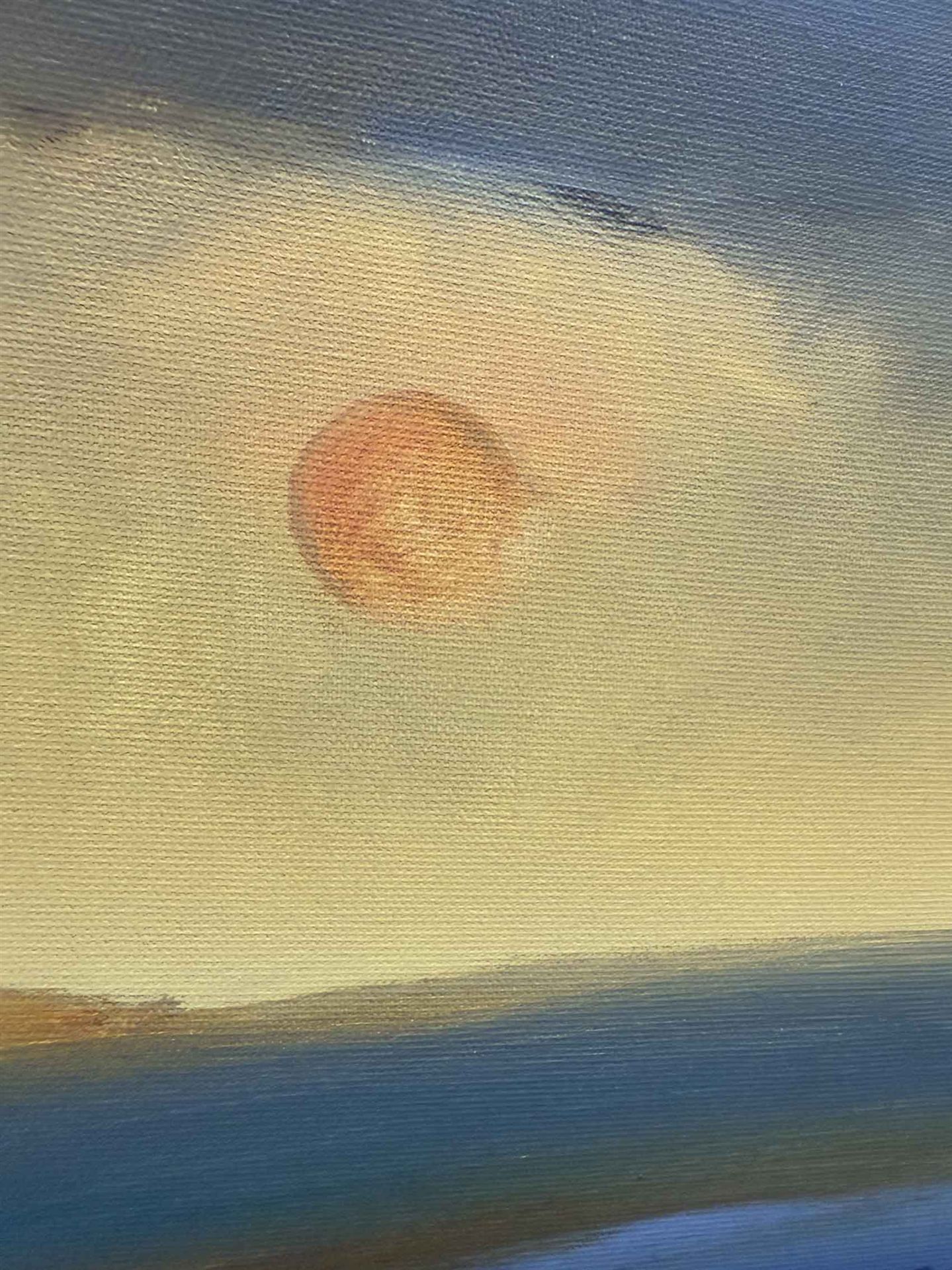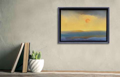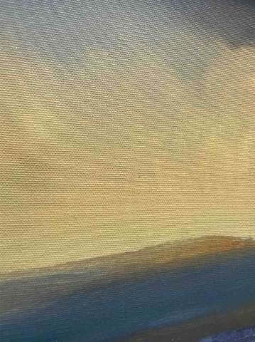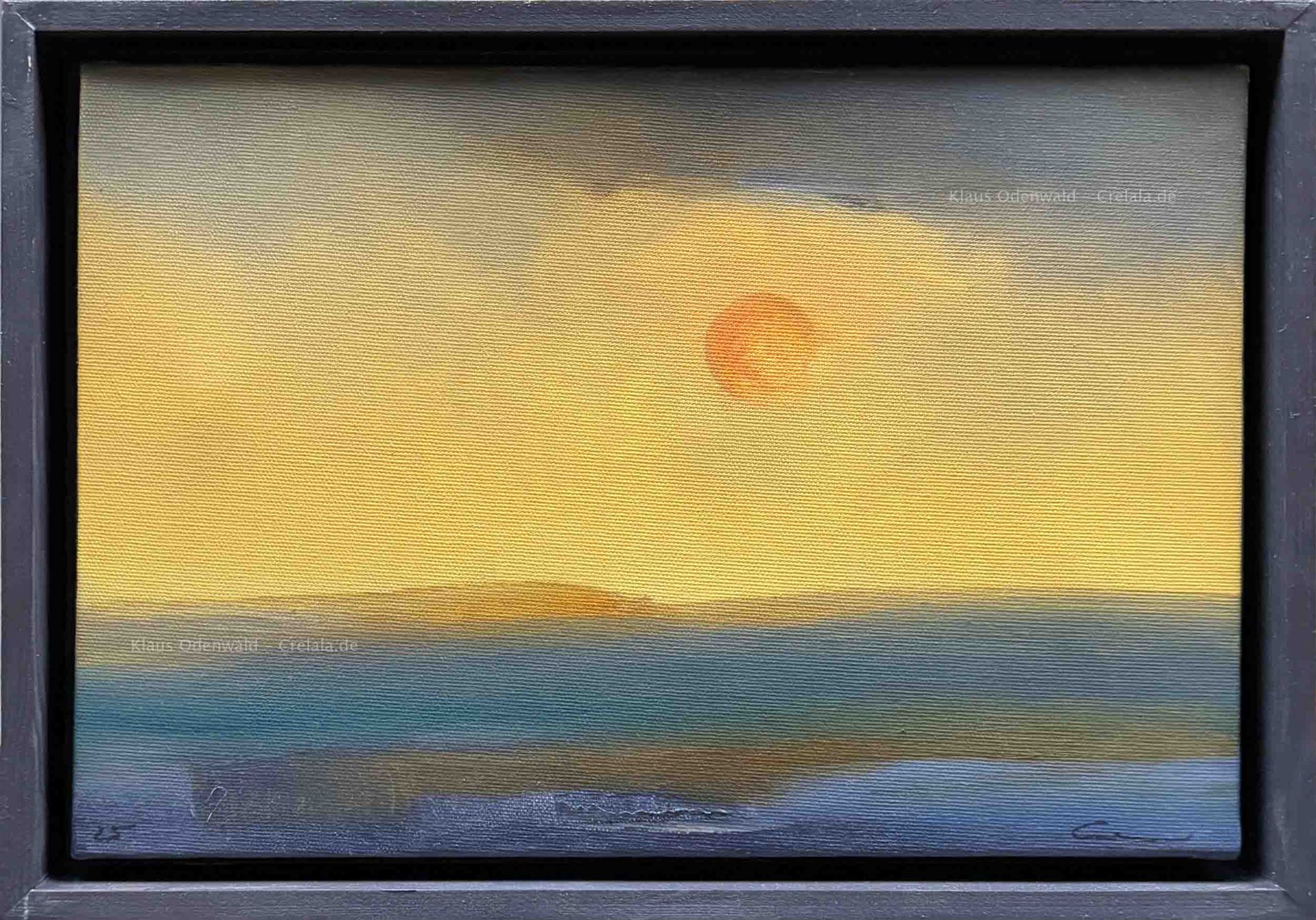 Das Kunstwerk "Sunset" wurde in Öl auf Leinen gemalt. Das Gemälde wird gerahmt zum Verkauf angeboten und hat ein Außenmaß von 35 cm x 24 cm x 4 cm.