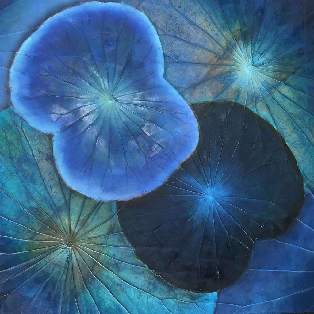 Das Kunstwerk "Blaue Stunde" wurde mit spezieller thailändischer Lotusmalerei erstellt. Das Kunstwerk ist mit Ölfarbe auf einem Lotusblatt auf Leinwand gemalt. Die Ränder der Leinwand sind schwarz gehalten. Das Außenmaß dieses Unikates beträgt 48 cm x 48 cm x 4 cm.
