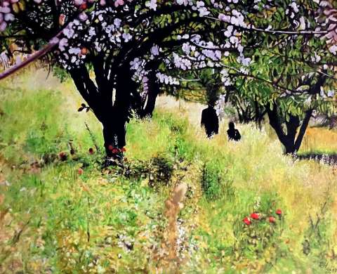 Das Kunstwerk "Streuobstwiese" wurde in Öl auf Leinwand gemalt. Das Außenmaß dieses Unikates beträgt 57 cm x 75 cm x 1,5 cm.