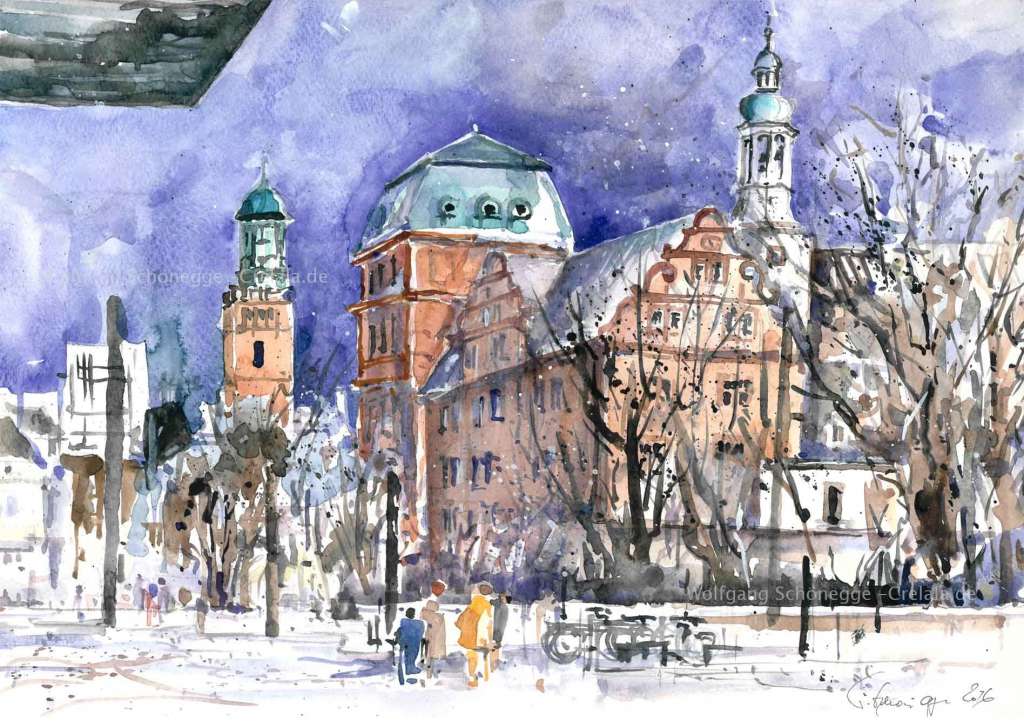 Das Kunstwerk "Darmstadt-Schloss" wurde in Aquarell auf Aquarellpapier gemalt. Das Außenmaß dieses Unikates beträgt 36 cm x 48 cm.