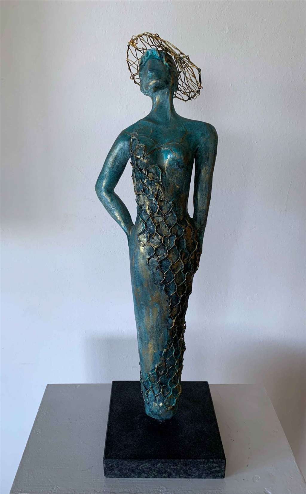 Die Skulptur "Dame mit Hut" wurde aus gebranntem, patiniertem Ton mit Draht erstellt. Die Skulptur wird mit Stahlplatte (20 cm x 20 cm x 3 cm) und mit Metallstab geliefert. Das Außenmaß dieses Unikates beträgt 45 cm x 17 cm x 12 cm und hat ein Gewicht von 2,5 kg.