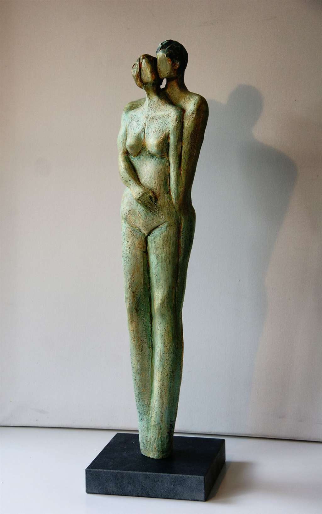 Die Skulptur "Paar" wurde aus gebranntem, patiniertem Ton (frostsicher) erstellt. Die Skulptur wird mit Ständer (25 cm x 15 cm) und mit Metallstab geliefert. Das Außenmaß dieses Unikates beträgt 53 cm x 14 cm x 8 cm und hat ein Gewicht von 5,2 kg.