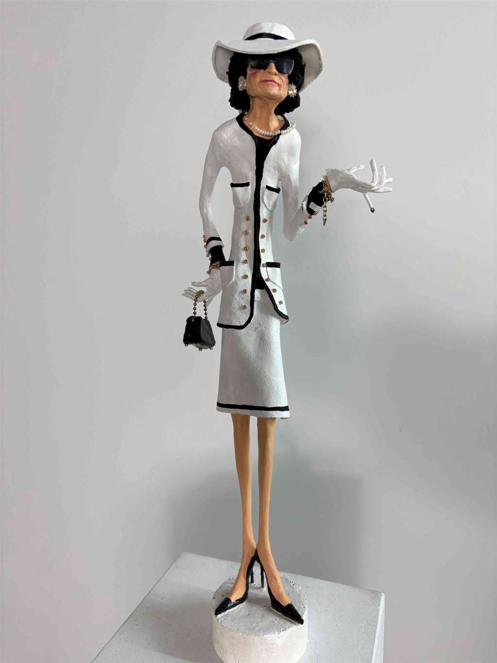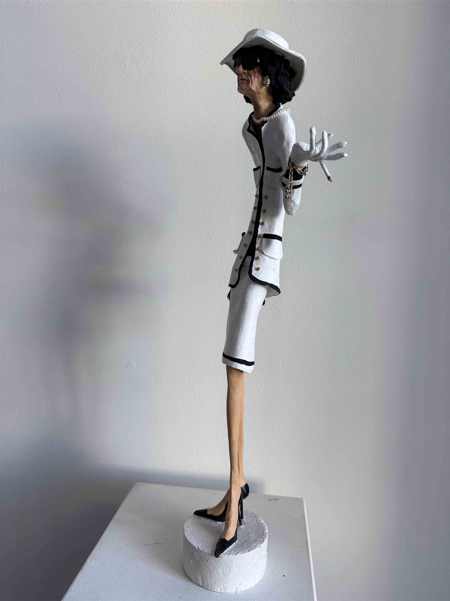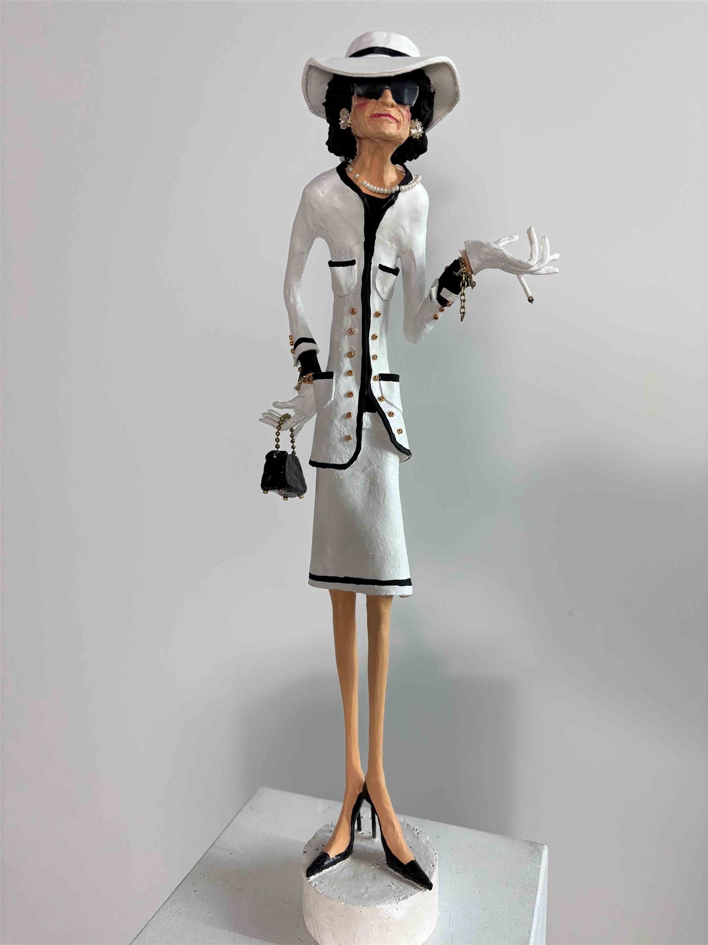 Die Skulptur "Coco Chanel 1" aus der Serie "Schräge Typen" ist aus Keramiplast mit Aquarellfarbe und Gouche koloriert. Das Außenmaß dieses Unikates beträgt 9 cm x 43 cm x 13 cm. Die Skulptur steht auf einem Gipssockel welcher 3,5 cm hoch ist und einen Durchmesser von 7 cm hat.