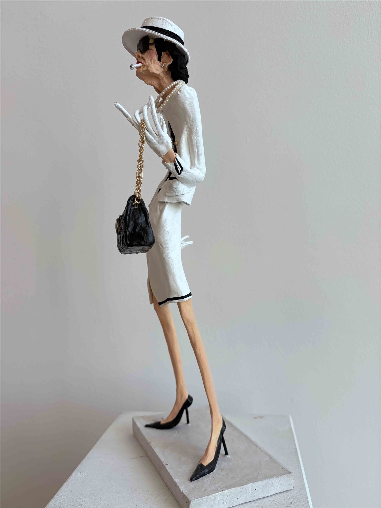 Die Skulptur "Coco Chanel" aus der Serie "Schräge Typen" ist aus Keramiplast mit Aquarellfarbe und Gouache koloriert. Das Außenmaß dieses Unikates beträgt 16 cm x 38 cm x 12 cm. Die Skulptur steht auf einem Gipssockel welcher die Maße 15 cm x 2 cm x 9 cm hat.