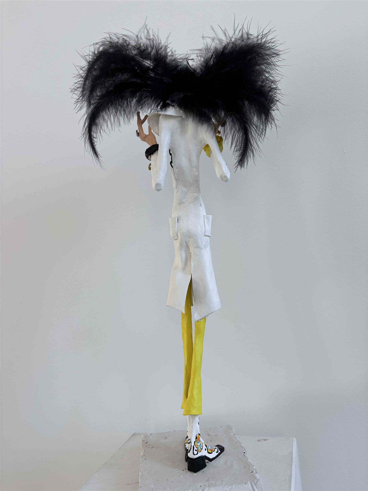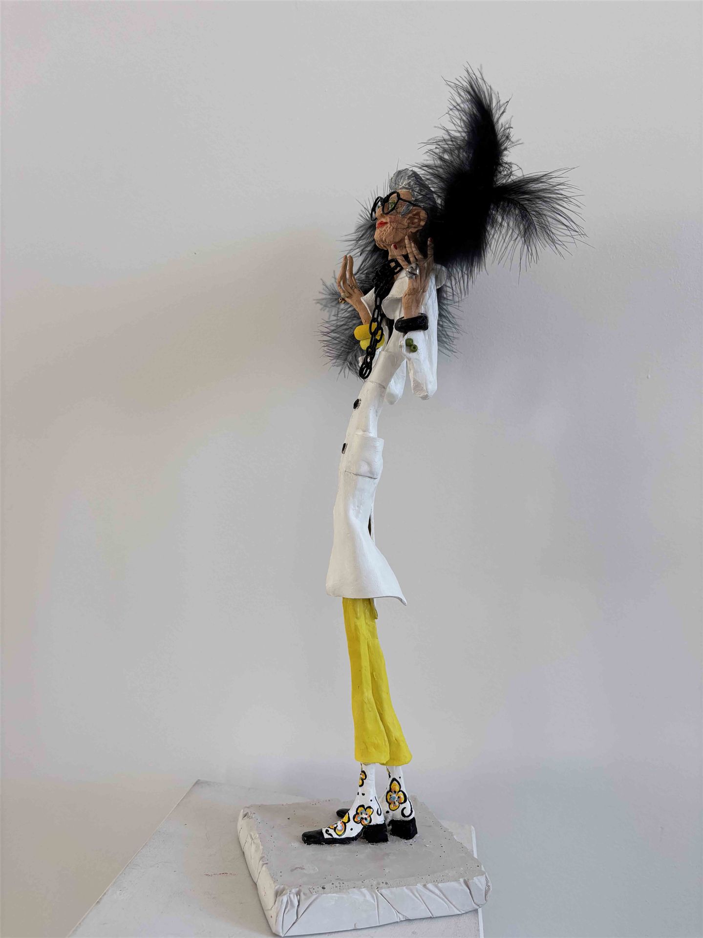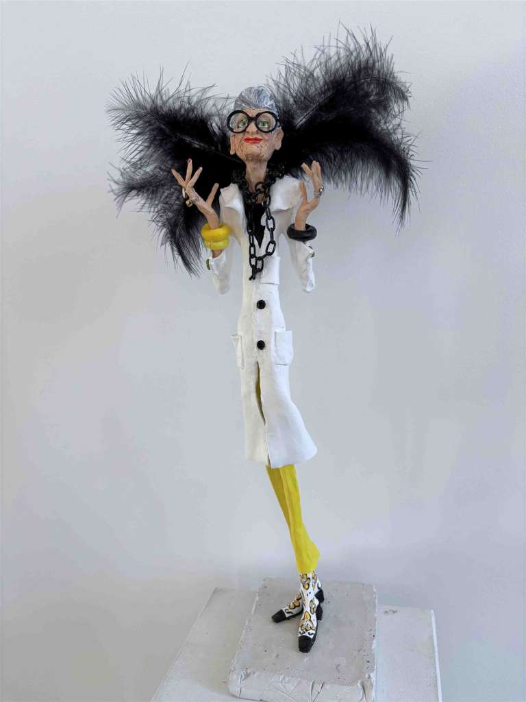 Die Skulptur "Iris Apfel" aus der Serie "Schräge Typen" ist aus Keramiplast mit Aquarellfarbe und Gouache koloriert. Das Außenmaß dieses Unikates beträgt 21 cm x 43 cm x 12 cm. Die Skulptur steht auf einem Gipssockel welcher die Maße 10 cm x 2cm x 12cm hat.