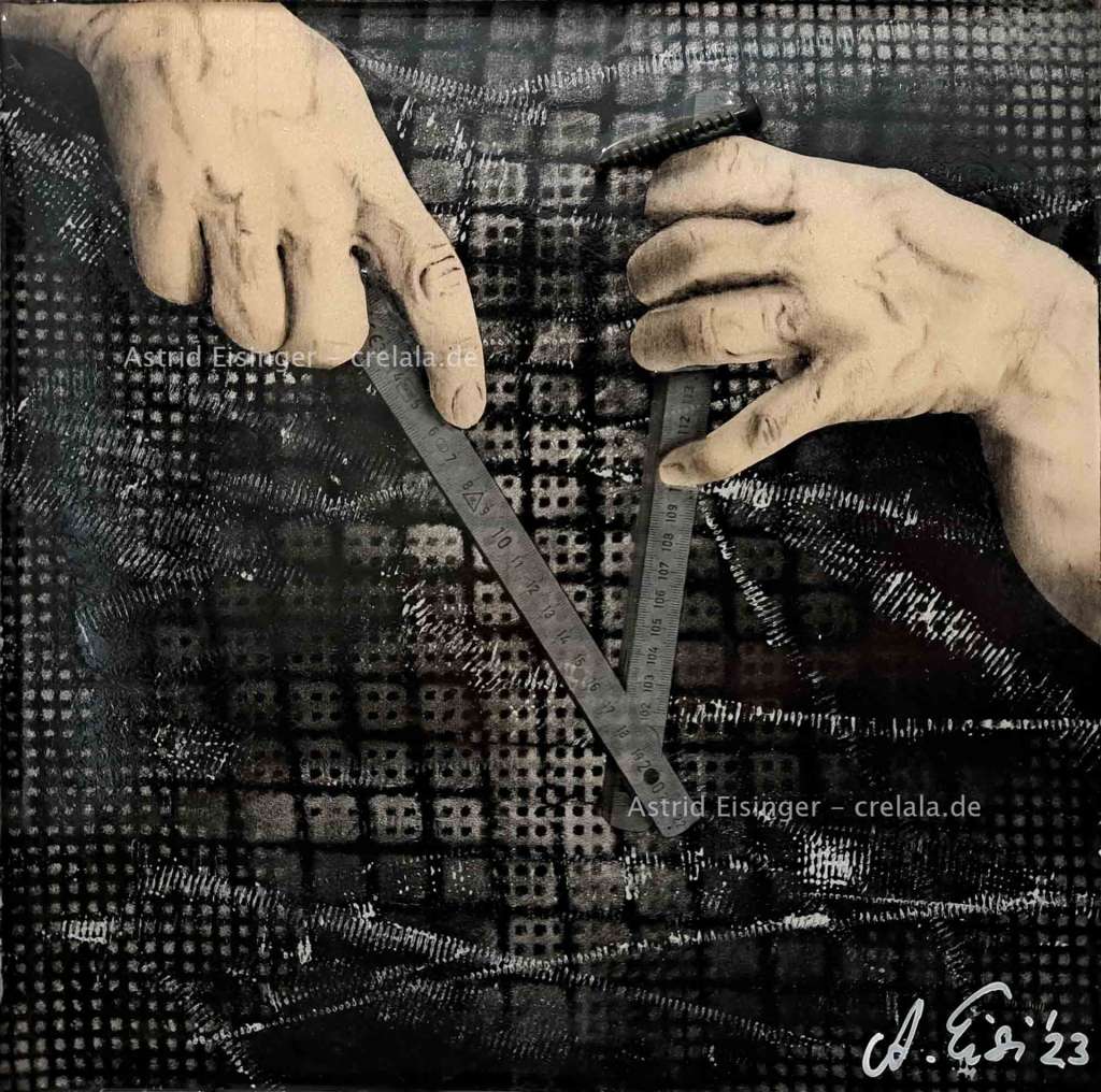 Astrid Eisinger arbeitet gerne projektbezogen und lädt sich hierzu Künstler aus anderen Bereichen ein. Ihr letztes Projekt „Kopf auf Kipp“ entstand mit einer Lyrikerin. Malerei und Gedichte (im Gutenbergmuseum mit alten Lettern gesetzt) inszenieren unsere Gefühlswelt in der Corona Zeit. Hierzu hat sie auch eine Performance erarbeitet, auf 1,5 qm.