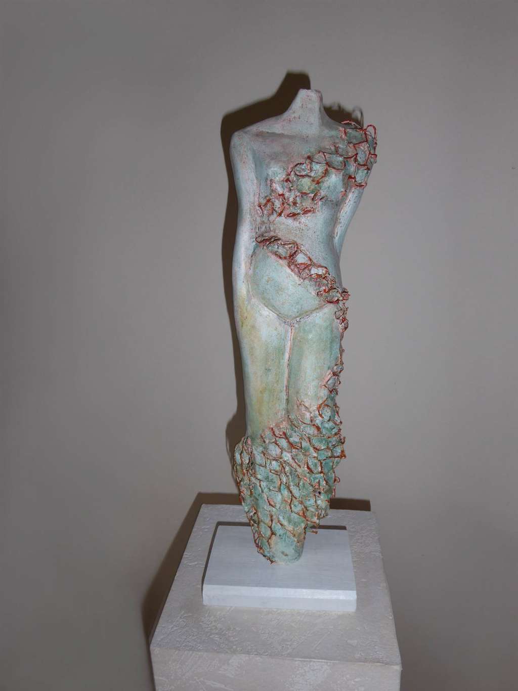 Meine Figuren aus Ton sind zum Teil überhöht oder kubistisch angelegt. Einige Plastiken sind mit Draht gearbeitet. Der beim Brennen mürbe gewordene Draht und die Spannung der beiden Materialien bei Hitze, lassen Risse und Abplatzungen sichtbar werden. Dadurch entsteht der Eindruck einer gewissen Versehrtheit und Fragilität. Erst nach dem Brennen werden die Figuren mit weiteren Farbschichten patiniert, das heißt, die Farbe wird eingerieben, oberflächlich wieder abgetragen und erneut mit mehreren Farbaufträgen versehen. In den Vertiefungen des Tonmaterials (Strukturen) bleiben vorherige Farbaufträge bestehen.