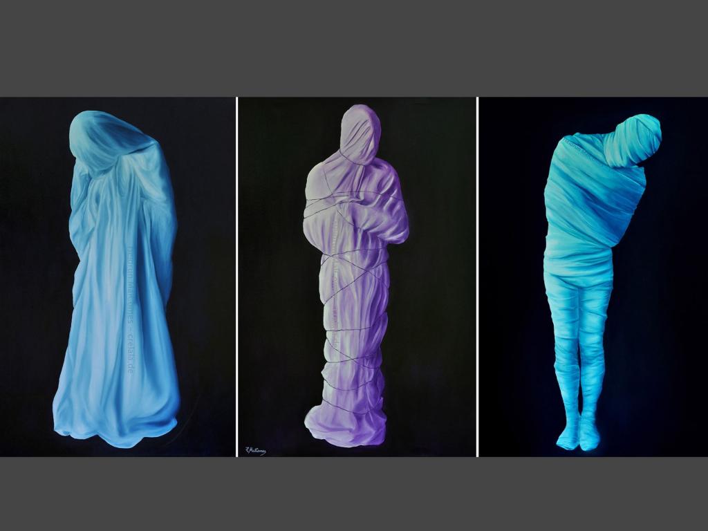 "Über ihre Arbeit sagt die Künstlerin selbst: "In der Malerei, der Bildhauerei und auch in der Fotografie entsteht für mich ein kreativer Akt, der sich in einem leidenschaftlichen Sich-Selbst-Verlieren äußert. Persönlich tief gehende Erlebnisse und Erfahrungen verbinden sich mit den Eindrücken der Massenmedien. Um für mich einen Denkraum der Besonnenheit öffnen zu können, setze ich diese Erfahrungen kreativ um, wobei immer das Individuum Mensch im Vordergrund steht, was sich auch als roter Faden durch meine literarische Arbeit zieht. Es ist wie ein Spiel, indem man Distanz wie auch Berührung schaffen kann. Wenn ein Betrachter meine Idee liebt, weil es ihm Hoffnung, Erkenntnis oder auch nur ein Gefühl gibt, dann ist das Spiel für mich gewonnen und ich erkläre gerne jedem Protagonisten die unterschiedlichen Geschichten, die hinter jedem einzelnen Werk stehen. Ich bin keine Blümchenmalerin, weil die Welt nicht Friede, Freude und Eierkuchen ist. Daher sind viele Themen in meinen Arbeiten auch schon mal an meiner eigenen Schmerzgrenze! Vielleicht liegt es auch daran, dass ich die Alten Meister, vor allem Caravaggio, verehre. Was ich nie tun würde, sind Arbeiten in Serie herzustellen. Dazu ist das Leben in mir und um mich herum viel zu sehr im Wandel, ist Veränderung, nicht Stillstand. Jedes Ändern ist ein Schritt nach vorne, weil wir leben. Leben heißt ändern. Wer nicht lebt, leidet !"