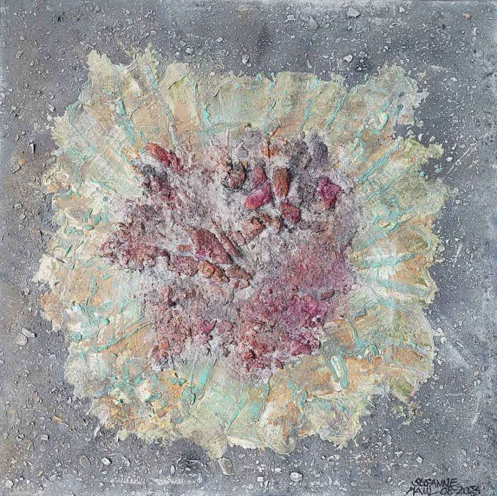 Die von ihr eingesetzten „Urstoffe“, wie Quarz, Schiefer, Basalt, und Eisen findet sie zum Großteil in Baustoffcontainern, durch Upcycling in ihren Bildern erwachen sie zu neuem Leben.