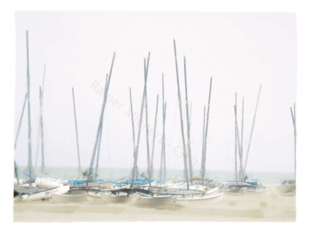 Die Aquagrafien von Rainer Mienert sind leise, wirken wie unter Nebelwolken, verwischt und heben bestimmte Details scharf gezeichnet hervor. In dieser Stille, die sich vor dem Betrachter ausbreitet, wohnt der Zauber der Bilder.